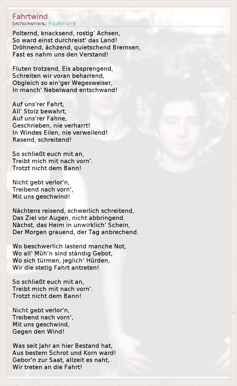 Грохот, треск отправить оси ржавый, Таким образом, однажды путешествовал по "земле! Гудение, стоны, визг тормозов, Это почти взял на Себя наши умы! Провокация наводнения, ледяные absprengend, Давайте идти вперед настаивая Ein'ger путь, хотя так мудр, Пропавшие без вести во многих дымовую завесу! Чтобы держать нас идешь кататься Все гордость сохранились Чтобы держать нас Goin 'флаг Написано, никогда не остается! На ветру части, никогда не задерживаясь! Разъяренный границы! И она должна включить в, Диски меня вперед ». Не вопреки запрету! Не давайте потерял, что Вождение вперед », Быстро с нами! Ночью путешествие, вряд ли границы,Цель, не заманчиво. Далее, внешний вид дома в нереальные,Седеющие утром, в день anbrechend. Если некоторые весомые обременительными трудностями, Где все "Müh'n постоянно ставку Где росла, каждые несколько "препятствия Мы никогда не ездить! И она должна включить в, Диски меня вперед ». Не вопреки запрету! Не давайте потерял, что Вождение вперед », Быстро с нами Против ветра! В каком году, поскольку это имеет запас Был изготовлен из лучших еды и кукурузы! Родились в семени, он всегда приходит, Возьмем езды!