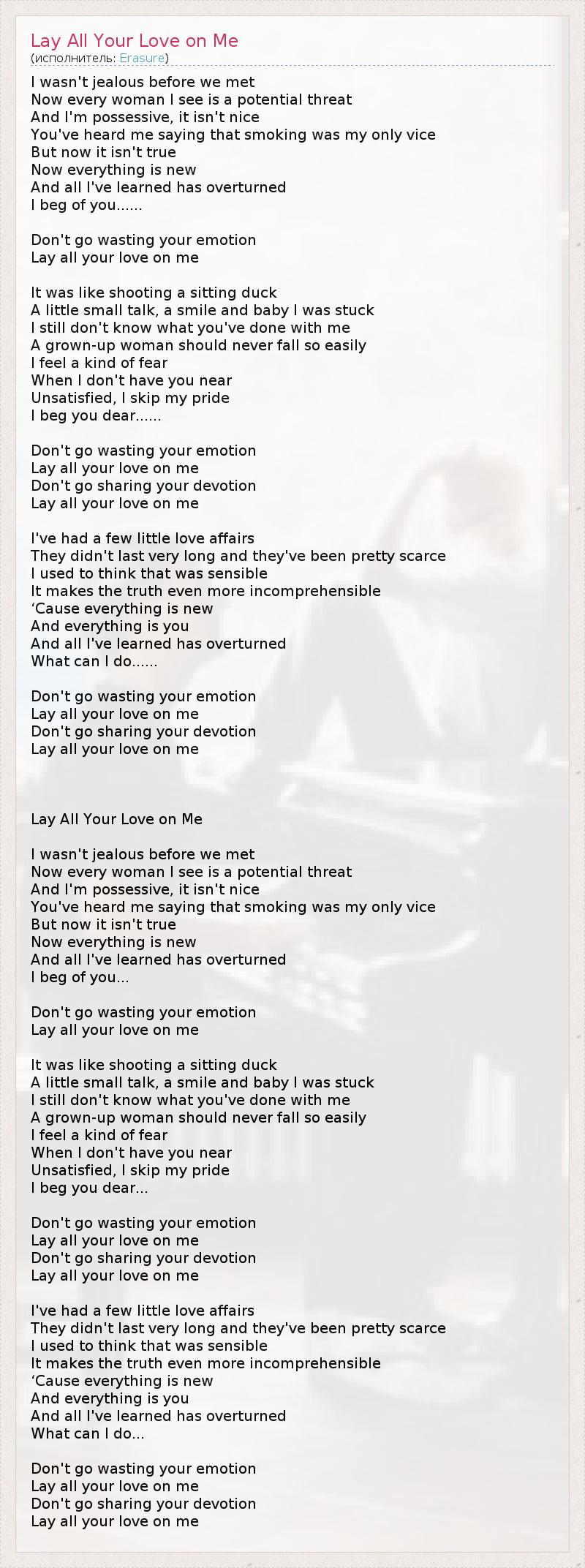 I wasn't jealous before we met Now every woman I see is a potential threat And I'm possessive, it isn't nice You've heard me saying that smoking was my only vice But now it isn't true Now everything is new And all I've learned has overturned I beg of you...... Don't go wasting your emotion Lay all your love on me It was like shooting a sitting duck A little small talk, a smile and baby I was stuck I still don't know what you've done with me A grown-up woman should never fall so easily I feel a kind of fear When I don't have you near Unsatisfied, I skip my pride I beg you dear...... Don't go wasting your emotion Lay all your love on me Don't go sharing your devotion Lay all your love on me I've had a few little love affairs They didn't last very long and they've been pretty scarce I used to think that was sensible It makes the truth even more incomprehensible ‘Cause everything is new And everything is you And all I've learned has overturned What can I do...... Don't go wasting your emotion Lay all your love on me Don't go sharing your devotion Lay all your love on me Lay All Your Love on Me I wasn't jealous before we met Now every woman I see is a potential threat And I'm possessive, it isn't nice You've heard me saying that smoking was my only vice But now it isn't true Now everything is new And all I've learned has overturned I beg of you... Don't go wasting your emotion Lay all your love on me It was like shooting a sitting duck A little small talk, a smile and baby I was stuck I still don't know what you've done with me A grown-up woman should never fall so easily I feel a kind of fear When I don't have you near Unsatisfied, I skip my pride I beg you dear... Don't go wasting your emotion Lay all your love on me Don't go sharing your devotion Lay all your love on me I've had a few little love affairs They didn't last very long and they've been pretty scarce I used to think that was sensible It makes the truth even more incomprehensible ‘Cause everything is new And everything is you And all I've learned has overturned What can I do... Don't go wasting your emotion Lay all your love on me Don't go sharing your devotion Lay all your love on me