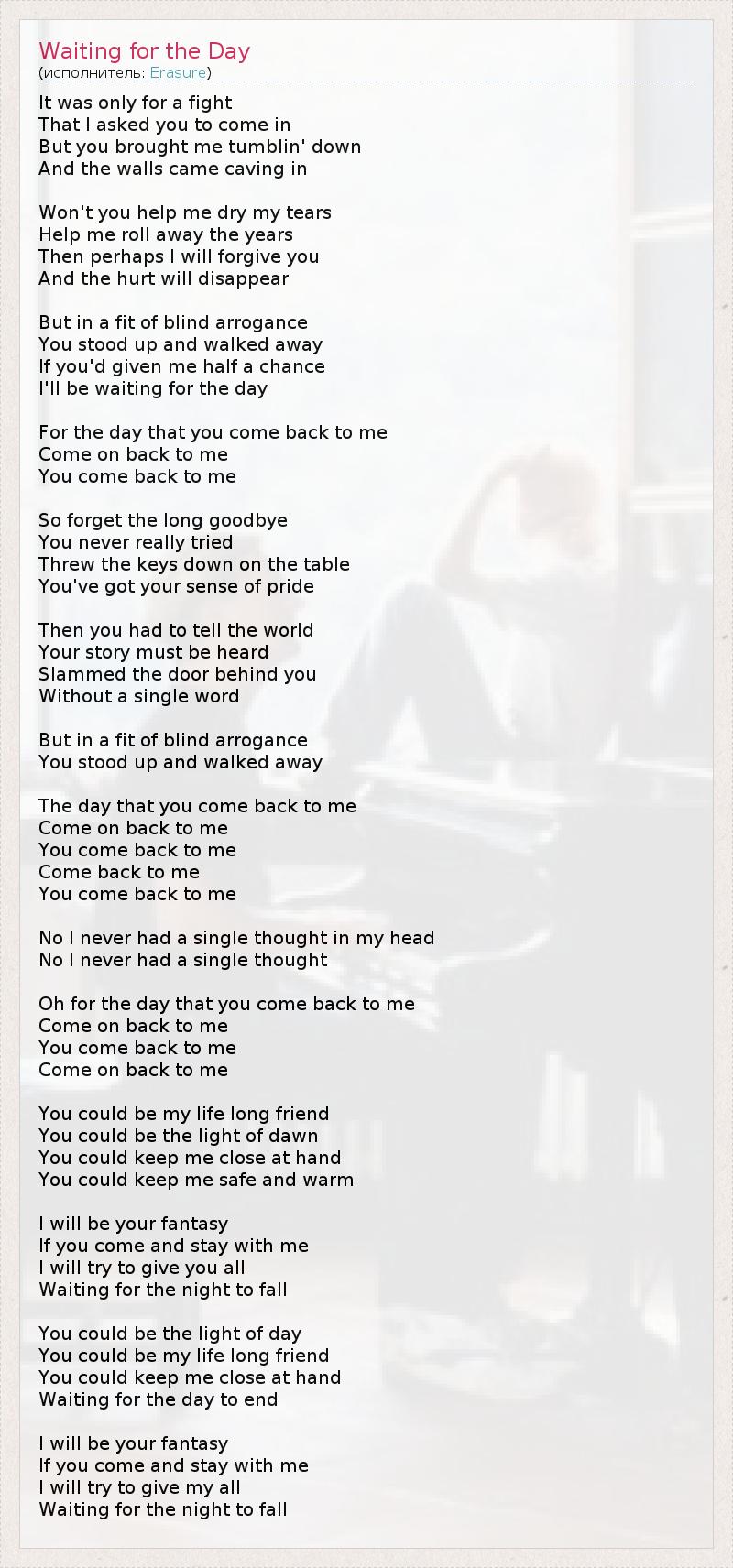 Только ради битвы Я попросил тебя зайти, Но ты сразил меня, И преграды пали. Не поможешь ли ты осушить мои слезы? Помоги мне прогнать прочь мои годы. После, возможно, я прощу тебя И боль исчезнет. Но в приступе слепой заносчивости Ты встал и ушел. Если бы дал мне пол-шанса, Я бы ждал дня. Дня, когда ты вернешься ко мне. Ну же, вернись ко мне! Когда ты вернешься ко мне. Так что забудь долгое прощание, Ты никогда по-настоящему не пытался. Кинул ключи на стол – В тебе есть чувство гордости. После тебе стоило бы был рассказать миру Свою историю, что должна быть услышана. Захлопнул дверь за собой, Не произнеся ни слова. Но в приступе слепой заносчивости Ты встал и ушел. День, когда ты вернешься ко мне. Ну же, вернись ко мне! Когда ты вернешься ко мне. Вернись ко мне! Когда ты вернешься ко мне. Нет, у меня ни разу не возникло ни одной мысли в голове. Нет, у меня ни разу не возникло ни одной мысли. О, в ожидании дня, когда ты вернешься ко мне. Ну же, вернись ко мне! Когда ты вернешься ко мне. Вернись ко мне! Ты мог бы стать верным другом моей жизни. Ты мог бы быть сиянием зари. Ты мог бы чувствовать меня рядом, держа за руку. Ты мог бы оберегать меня и согревать. Я буду твоим воображением, Если ты придешь и останешься со мной. Я попытаюсь дать тебе все, Ожидая наступления ночи. Ты мог бы стать верным другом моей жизни, Ты мог бы быть сиянием зари, Ты мог бы чувствовать меня рядом, держа за руку, В ожидании завершения дня. Я буду твоим воображением, Если ты придешь и останешься со мной. Я попытаюсь дать тебе все, Ожидая наступления ночи.