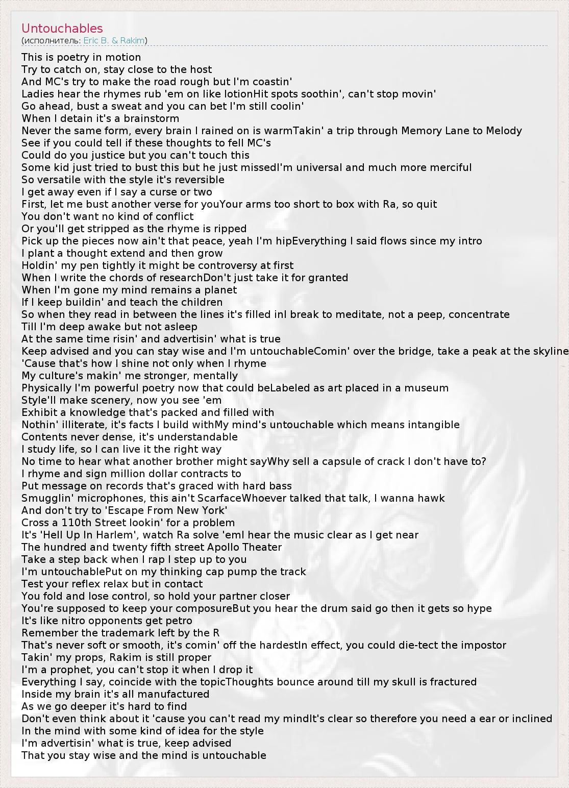 Это интересно:Они никогда не были в мейнстриме, но в течение так называемого золотого века рэп-музыки конца 80-х годов Eric B. & Rakim почти повсеместно были признаны главной DJ/MC командой в хип-хопе. Мало того, что у них была превосходная и индивидуальная техника, каждый из них представлял абсолютное состояние искусства, отражённое в их мастерстве. Eric B. был чрезвычайно влиятельным ди-джеем... продолжение