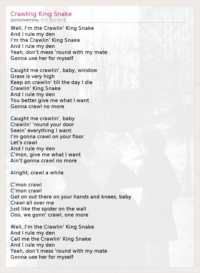 Well, I'm the Crawlin' King Snake And I rule my den I'm the Crawlin' King Snake And I rule my den Yeah, don't mess 'round with my mate Gonna use her for myself Caught me crawlin', baby, window Grass is very high Keep on crawlin' till the day I die Crawlin' King Snake And I rule my den You better give me what I want Gonna crawl no more Caught me crawlin', baby Crawlin' 'round your door Seein' everything I want I'm gonna crawl on your floor Let's crawl And I rule my den C'mon, give me what I want Ain't gonna crawl no more Alright, crawl a while C'mon crawl C'mon crawl Get on out there on your hands and knees, baby Crawl all over me Just like the spider on the wall Ooo, we gonn' crawl, one more Well, I'm the Crawlin' King Snake And I rule my den Call me the Crawlin' King Snake And I rule my den Yeah, don't mess 'round with my mate Gonna use her for myself