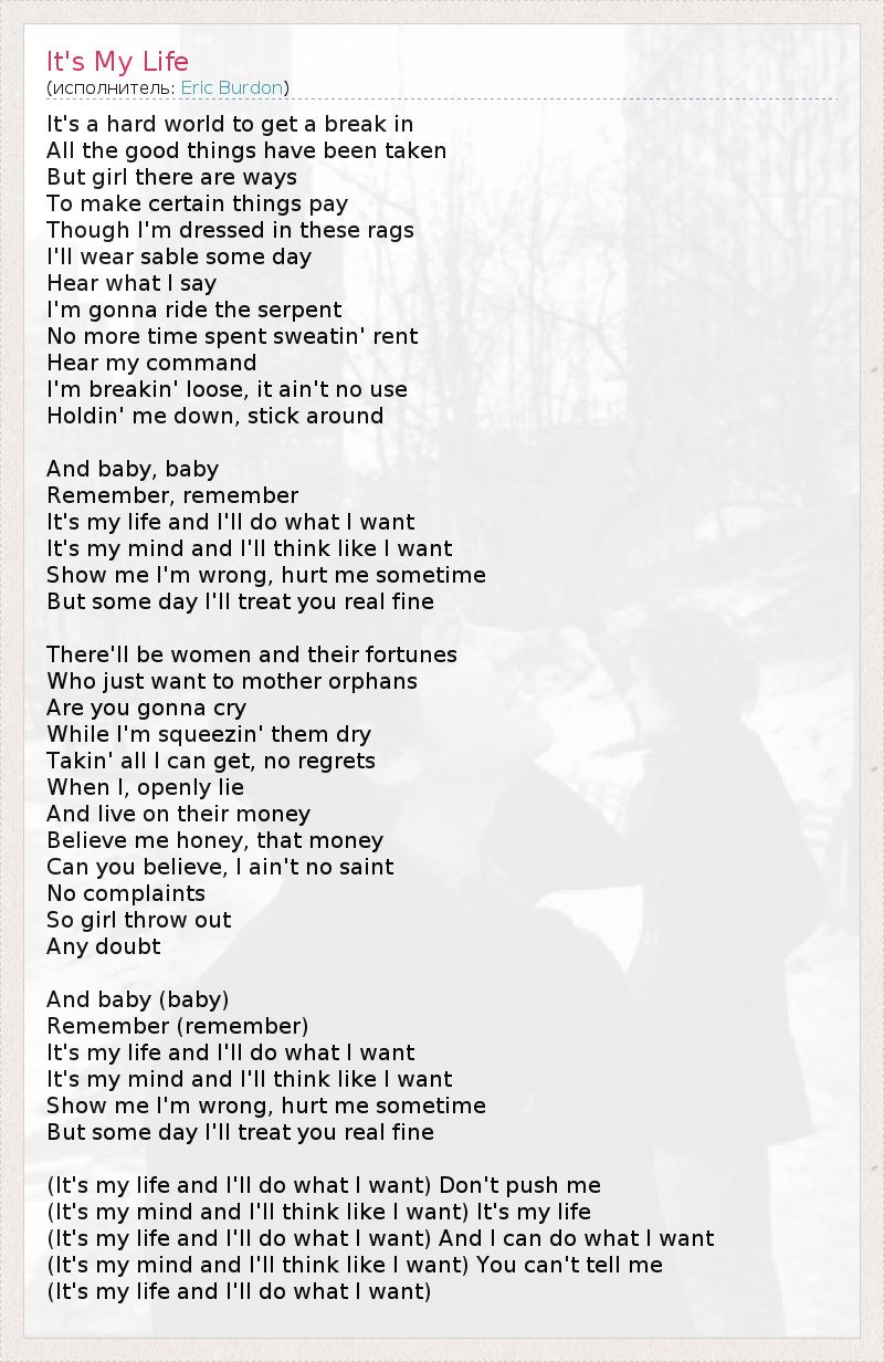 It's a hard world to get a break in All the good things have been taken But girl there are ways To make certain things pay Though I'm dressed in these rags I'll wear sable some day Hear what I say I'm gonna ride the serpent No more time spent sweatin' rent Hear my command I'm breakin' loose, it ain't no use Holdin' me down, stick around And baby, baby Remember, remember It's my life and I'll do what I want It's my mind and I'll think like I want Show me I'm wrong, hurt me sometime But some day I'll treat you real fine There'll be women and their fortunes Who just want to mother orphans Are you gonna cry While I'm squeezin' them dry Takin' all I can get, no regrets When I, openly lie And live on their money Believe me honey, that money Can you believe, I ain't no saint No complaints So girl throw out Any doubt And baby (baby) Remember (remember) It's my life and I'll do what I want It's my mind and I'll think like I want Show me I'm wrong, hurt me sometime But some day I'll treat you real fine (It's my life and I'll do what I want) Don't push me (It's my mind and I'll think like I want) It's my life (It's my life and I'll do what I want) And I can do what I want (It's my mind and I'll think like I want) You can't tell me (It's my life and I'll do what I want)