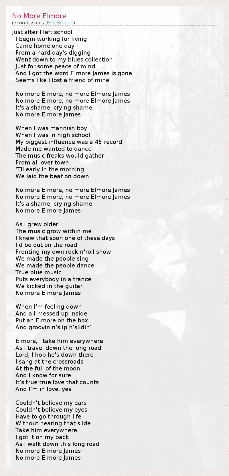 А как ты думаешь, о чем песня "No More Elmore" ?