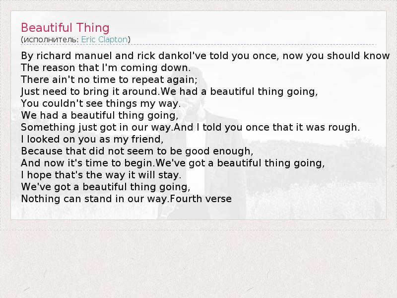 By richard manuel and rick dankoI've told you once, now you should know The reason that I'm coming down. There ain't no time to repeat again; Just need to bring it around.We had a beautiful thing going, You couldn't see things my way. We had a beautiful thing going, Something just got in our way.And I told you once that it was rough. I looked on you as my friend, Because that did not seem to be good enough, And now it's time to begin.We've got a beautiful thing going, I hope that's the way it will stay. We've got a beautiful thing going, Nothing can stand in our way.Fourth verse