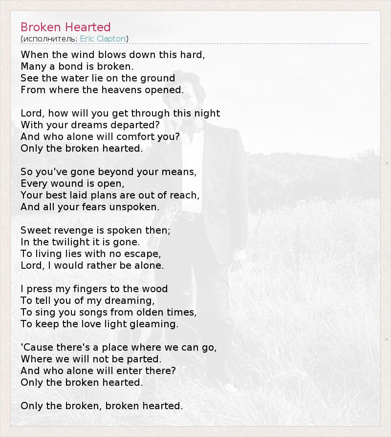 Когда ветер дует так сильно, Многие связи разрываются. Посмотри на воду на земле Из разверзшихся небес. Господи, как ты переживёшь эту ночь, Когда все твои мечты разбились? И кто один станет утешать тебя? Только тот, у кого разбито сердце. Итак, ты зашёл далеко за привычные средства, И каждая твоя рана кровоточит. Твои лучшие планы теперь недостижимы, А страхи не высказаны. Зато можно выразить сладкую месть, Она исчезает с наступлением сумерек, И от себя тебе не убежать. Господи, уж лучше мне быть одному. Я прижимаю пальцы к этому куску дерева, 1 Чтобы рассказать тебе о своих мечтах, Чтобы спеть песню из старых времён, Чтобы свет любви продолжал сиять. Ведь есть место, куда мы можем пойти, Где нам не придется расставаться. И кто один войдет туда? Только тот, у кого разбито сердце. Только тот, у кого разбито, разбито сердце... 1 – Имеется в виду гитара.