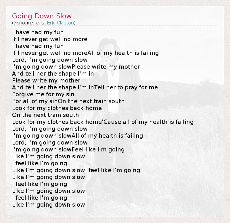 I have had my fun If I never get well no more I have had my fun If I never get well no moreAll of my health is failing Lord, I'm going down slow I'm going down slowPlease write my mother And tell her the shape I'm in Please write my mother And tell her the shape I'm inTell her to pray for me Forgive me for my sin For all of my sinOn the next train south Look for my clothes back home On the next train south Look for my clothes back home'Cause all of my health is failing Lord, I'm going down slow I'm going down slowAll of my health is failing Lord, I'm going down slow I'm going down slowFeel like I'm going Like I'm going down slow I feel like I'm going Like I'm going down slowI feel like I'm going Like I'm going down slow I feel like I'm going Like I'm going down slow I feel like I'm going Like I'm going down slow