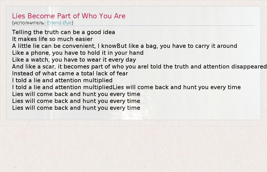 ГлавнаяИсполнителиErlend ØyeLies Become Part of Who You Are