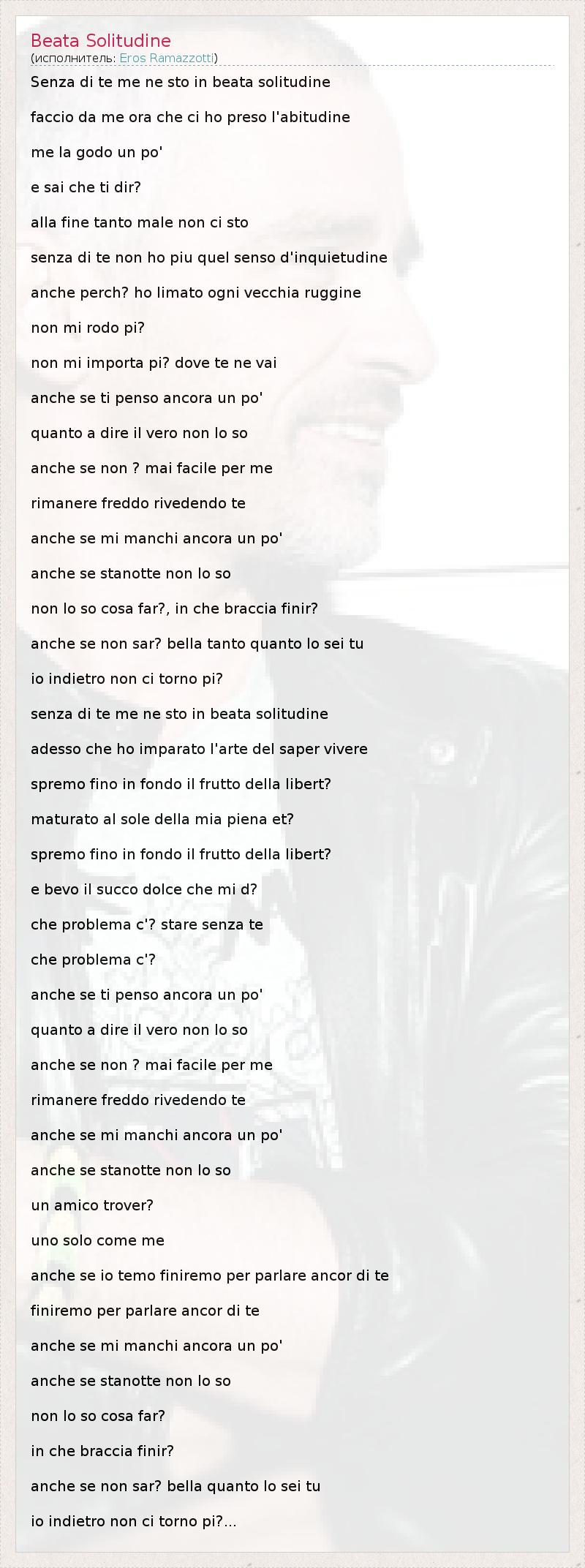 Это интересно:Если бы родители маленького Эроса знали, что в скором будущем их сын станет всемирно известным, то наверняка не стали бы его наказывать за поздние возвращения домой и неубранную комнату.Eros Ramazzotti родился в 1963 году в Риме. Учеба нелегко давалась юному музыканту, и, провалив вступительные экзамены в местную консерваторию, он переезжает в Милан, чтобы попробовать себя в большом мире музыки.... продолжение