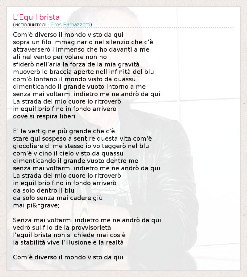 Com'è diverso il mondo visto da qui sopra un filo immaginario nel silenzio che c'è attraverserò l'immenso che ho davanti a me ali nel vento per volare non ho sfiderò nell'aria la forza della mia gravità muoverò le braccia aperte nell'infinità del blu com'ò lontano il mondo visto da quassu dimenticando il grande vuoto intorno a me senza mai voltarmi indietro me ne andrò da qui La strada del mio cuore io ritroverò in equilibrio fino in fondo arriverò dove si respira liberi E' la vertigine più grande che c'è stare qui sospeso a sentire questa vita com'è giocoliere di me stesso io volteggerò nel blu com'è vicino il cielo visto da quassu dimenticando il grande vuoto dentro me senza mai voltarmi indietro me ne andrò da qui La strada del mio cuore io ritroverò in equilibrio fino in fondo arriverò da solo dentro il blu da solo senza mai cadere giù mai pi&гgrave; Senza mai voltarmi indietro me ne andrò da qui vedrò sul filo della provvisorietà l'equilibrista non si chiede mai cos'è la stabilità vive l'illusione e la realtà Com'è diverso il mondo visto da qui