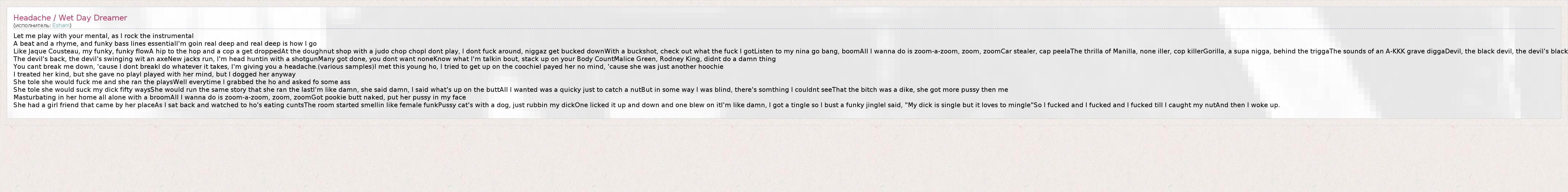 Let me play with your mental, as I rock the instrumental A beat and a rhyme, and funky bass lines essentialI'm goin real deep and real deep is how I go Like Jaque Cousteau, my funky, funky flowA hip to the hop and a cop a get droppedAt the doughnut shop with a judo chop chopI dont play, I dont fuck around, niggaz get bucked downWith a buckshot, check out what the fuck I gotListen to my nina go bang, boomAll I wanna do is zoom-a-zoom, zoom, zoomCar stealer, cap peelaThe thrilla of Manilla, none iller, cop killerGorilla, a supa nigga, behind the triggaThe sounds of an A-KKK grave diggaDevil, the black devil, the devil's black The devil's back, the devil's swinging wit an axeNew jacks run, I'm head huntin with a shotgunMany got done, you dont want noneKnow what I'm talkin bout, stack up on your Body CountMalice Green, Rodney King, didnt do a damn thing You cant break me down, 'cause I dont breakI do whatever it takes, I'm giving you a headache.(various samples)I met this young ho, I tried to get up on the coochieI payed her no mind, 'cause she was just another hoochie I treated her kind, but she gave no playI played with her mind, but I dogged her anyway She tole she would fuck me and she ran the playsWell everytime I grabbed the ho and asked fo some ass She tole she would suck my dick fifty waysShe would run the same story that she ran the lastI'm like damn, she said damn, I said what's up on the buttAll I wanted was a quicky just to catch a nutBut in some way I was blind, there's somthing I couldnt seeThat the bitch was a dike, she got more pussy then me Masturbating in her home all alone with a broomAll I wanna do is zoom-a-zoom, zoom, zoomGot pookie butt naked, put her pussy in my face She had a girl friend that came by her placeAs I sat back and watched to ho's eating cuntsThe room started smellin like female funkPussy cat's with a dog, just rubbin my dickOne licked it up and down and one blew on itI'm like damn, I got a tingle so I bust a funky jingleI said, "My dick is single but it loves to mingle"So I fucked and I fucked and I fucked till I caught my nutAnd then I woke up.