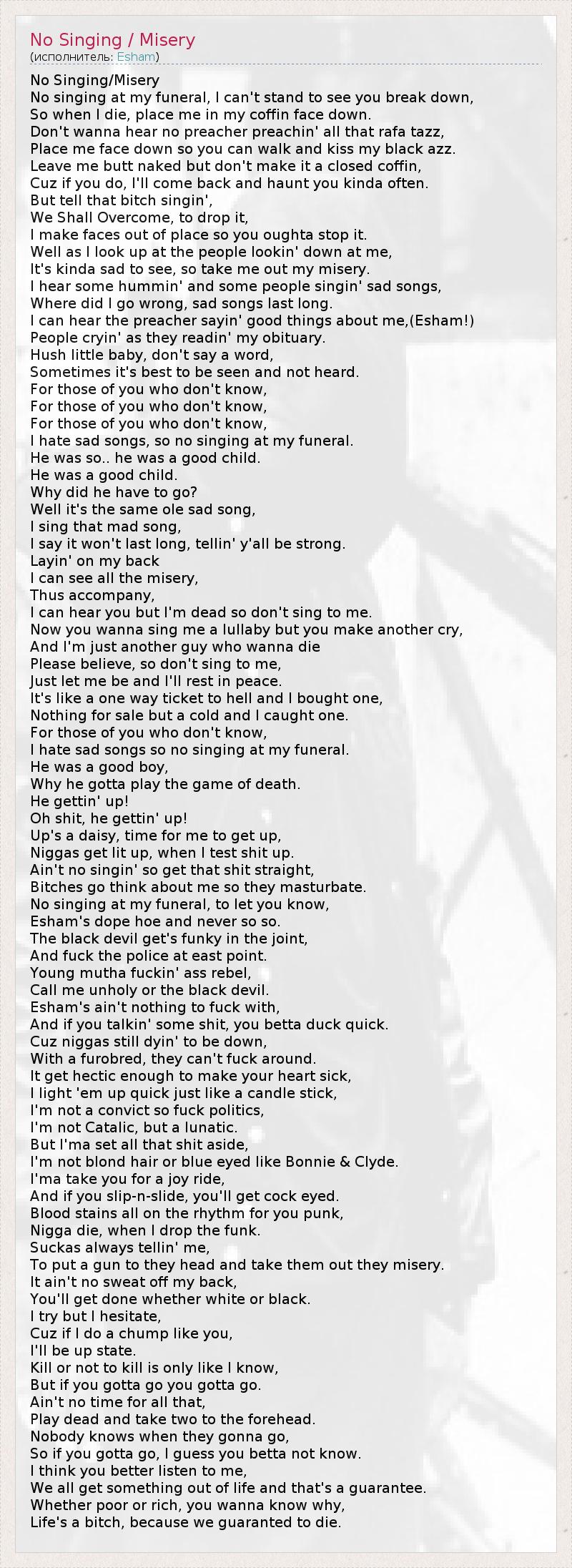 No Singing/Misery No singing at my funeral, I can't stand to see you break down, So when I die, place me in my coffin face down. Don't wanna hear no preacher preachin' all that rafa tazz, Place me face down so you can walk and kiss my black azz. Leave me butt naked but don't make it a closed coffin, Cuz if you do, I'll come back and haunt you kinda often. But tell that bitch singin', We Shall Overcome, to drop it, I make faces out of place so you oughta stop it. Well as I look up at the people lookin' down at me, It's kinda sad to see, so take me out my misery. I hear some hummin' and some people singin' sad songs, Where did I go wrong, sad songs last long. I can hear the preacher sayin' good things about me,(Esham!) People cryin' as they readin' my obituary. Hush little baby, don't say a word, Sometimes it's best to be seen and not heard. For those of you who don't know, For those of you who don't know, For those of you who don't know, I hate sad songs, so no singing at my funeral. He was so.. he was a good child. He was a good child. Why did he have to go? Well it's the same ole sad song, I sing that mad song, I say it won't last long, tellin' y'all be strong. Layin' on my back I can see all the misery, Thus accompany, I can hear you but I'm dead so don't sing to me. Now you wanna sing me a lullaby but you make another cry, And I'm just another guy who wanna die Please believe, so don't sing to me, Just let me be and I'll rest in peace. It's like a one way ticket to hell and I bought one, Nothing for sale but a cold and I caught one. For those of you who don't know, I hate sad songs so no singing at my funeral. He was a good boy, Why he gotta play the game of death. He gettin' up! Oh shit, he gettin' up! Up's a daisy, time for me to get up, Niggas get lit up, when I test shit up. Ain't no singin' so get that shit straight, Bitches go think about me so they masturbate. No singing at my funeral, to let you know, Esham's dope hoe and never so so. The black devil get's funky in the joint, And fuck the police at east point. Young mutha fuckin' ass rebel, Call me unholy or the black devil. Esham's ain't nothing to fuck with, And if you talkin' some shit, you betta duck quick. Cuz niggas still dyin' to be down, With a furobred, they can't fuck around. It get hectic enough to make your heart sick, I light 'em up quick just like a candle stick, I'm not a convict so fuck politics, I'm not Catalic, but a lunatic. But I'ma set all that shit aside, I'm not blond hair or blue eyed like Bonnie & Clyde. I'ma take you for a joy ride, And if you slip-n-slide, you'll get cock eyed. Blood stains all on the rhythm for you punk, Nigga die, when I drop the funk. Suckas always tellin' me, To put a gun to they head and take them out they misery. It ain't no sweat off my back, You'll get done whether white or black. I try but I hesitate, Cuz if I do a chump like you, I'll be up state. Kill or not to kill is only like I know, But if you gotta go you gotta go. Ain't no time for all that, Play dead and take two to the forehead. Nobody knows when they gonna go, So if you gotta go, I guess you betta not know. I think you better listen to me, We all get something out of life and that's a guarantee. Whether poor or rich, you wanna know why, Life's a bitch, because we guaranted to die.