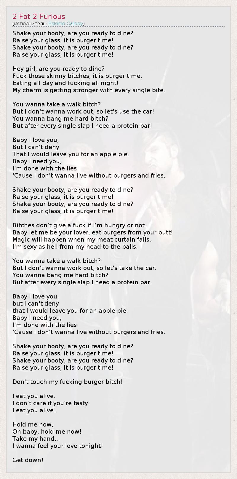 А как ты думаешь, о чем песня "2 Fat 2 Furious" ?