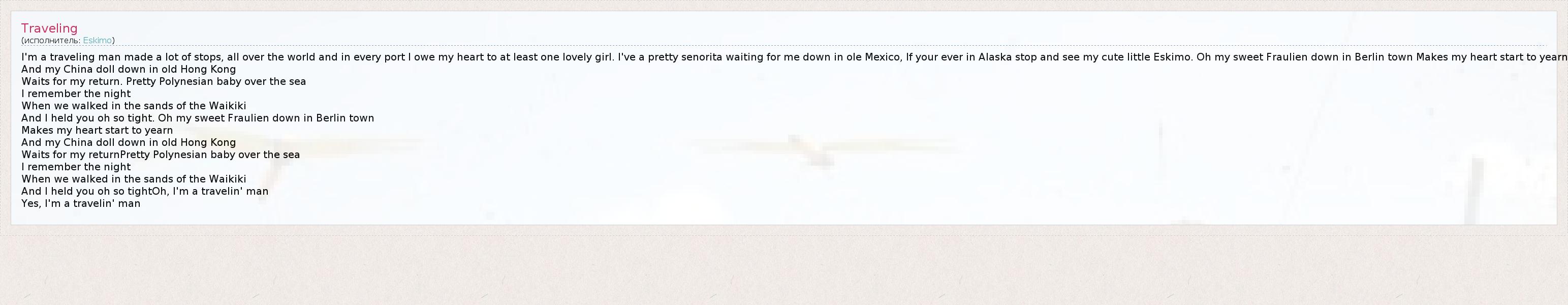 I'm a traveling man made a lot of stops, all over the world and in every port I owe my heart to at least one lovely girl. I've a pretty senorita waiting for me down in ole Mexico, If your ever in Alaska stop and see my cute little Eskimo. Oh my sweet Fraulien down in Berlin town Makes my heart start to yearn