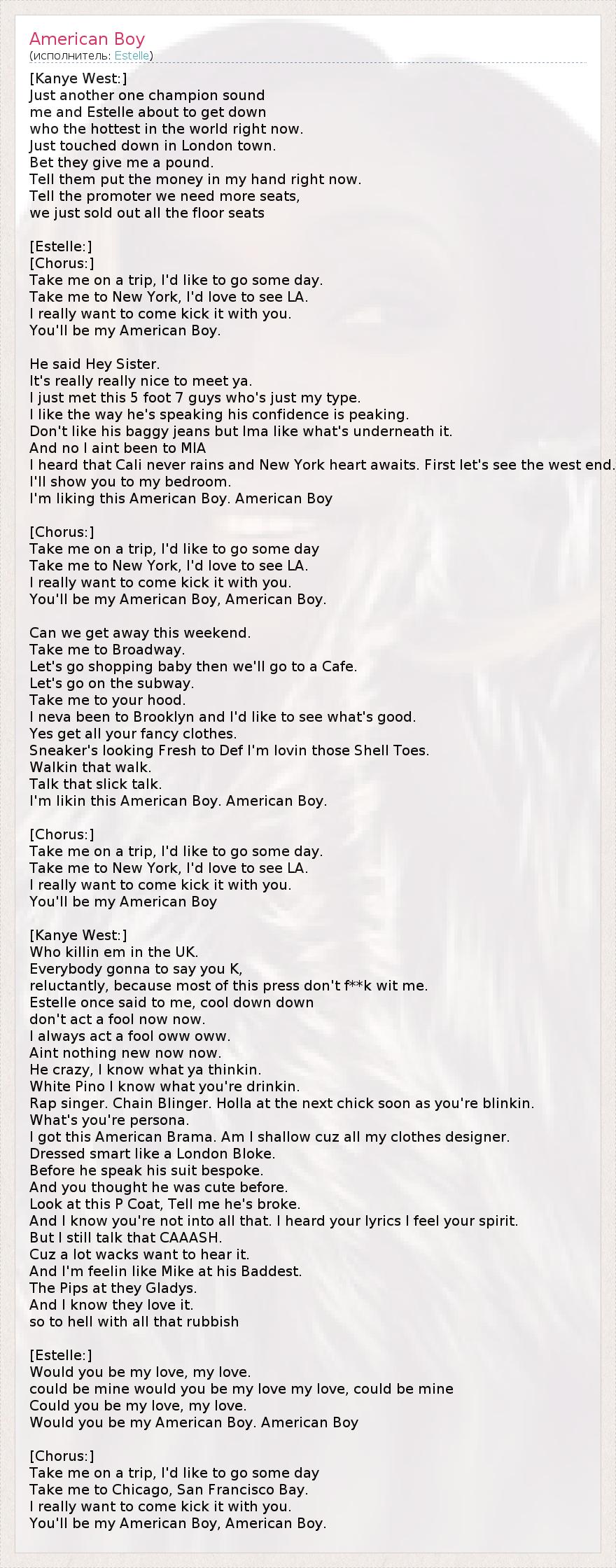 Это интересно:Эстель (англ. Estelle Fanta Swaray; род. 18 января 1980 г., Лондон, Великобритания) - британская певица, автор песен, рэпер, продюсер. Всемирная известность пришла после выпуска сингла 'American Boy', записанного при участии Канье Веста (англ. Kanye West). В 2009 эта песня была отмечена премией 'Грэмми' в категории 'best rap/sung collaboration' .