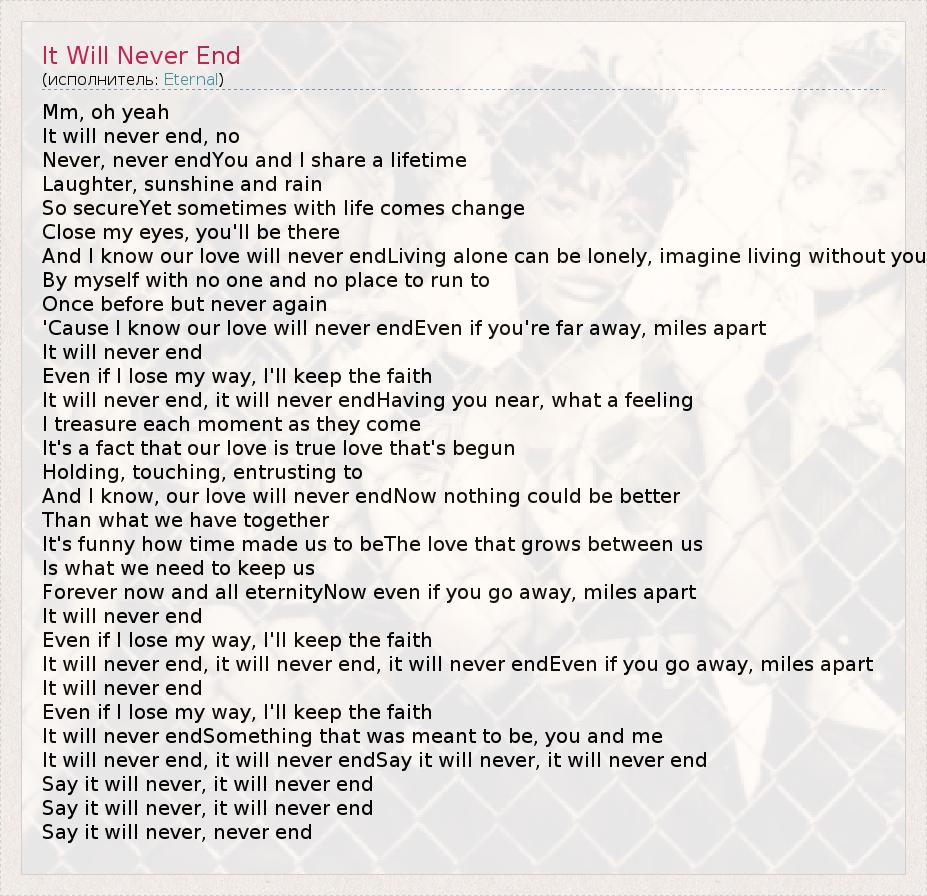 Mm, oh yeah It will never end, no Never, never endYou and I share a lifetime Laughter, sunshine and rain So secureYet sometimes with life comes change Close my eyes, you'll be there And I know our love will never endLiving alone can be lonely, imagine living without you By myself with no one and no place to run to Once before but never again 'Cause I know our love will never endEven if you're far away, miles apart It will never end Even if I lose my way, I'll keep the faith It will never end, it will never endHaving you near, what a feeling I treasure each moment as they come It's a fact that our love is true love that's begun Holding, touching, entrusting to And I know, our love will never endNow nothing could be better Than what we have together It's funny how time made us to beThe love that grows between us Is what we need to keep us Forever now and all eternityNow even if you go away, miles apart It will never end Even if I lose my way, I'll keep the faith It will never end, it will never end, it will never endEven if you go away, miles apart It will never end Even if I lose my way, I'll keep the faith It will never endSomething that was meant to be, you and me It will never end, it will never endSay it will never, it will never end Say it will never, it will never end Say it will never, it will never end Say it will never, never end