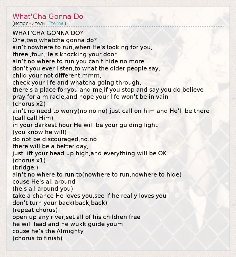 WHAT'CHA GONNA DO? One,two,whatcha gonna do? ain't nowhere to run,when He's looking for you, three ,four,He's knocking your door ain't no where to run you can't hide no more don't you ever listen,to what the older people say, child your not different,mmm, check your life and whatcha going through, there's a place for you and me,if you stop and say you do believe pray for a miracle,and hope your life won't be in vain (chorus x2) ain't no need to worry(no no no) just call on him and He'll be there (call call Him) in your darkest hour He will be your guiding light (you know he will) do not be discouraged,no.no there will be a better day, just lift your head up high,and everything will be OK (chorus x1) (bridge:) ain't no where to run to(nowhere to run,nowhere to hide) couse He's all around (he's all around you) take a chance He loves you,see if he really loves you don't turn your back(back,back) (repeat chorus) open up any river,set all of his children free he will lead and he wukk guide youm couse he's the Almighty (chorus to finish)