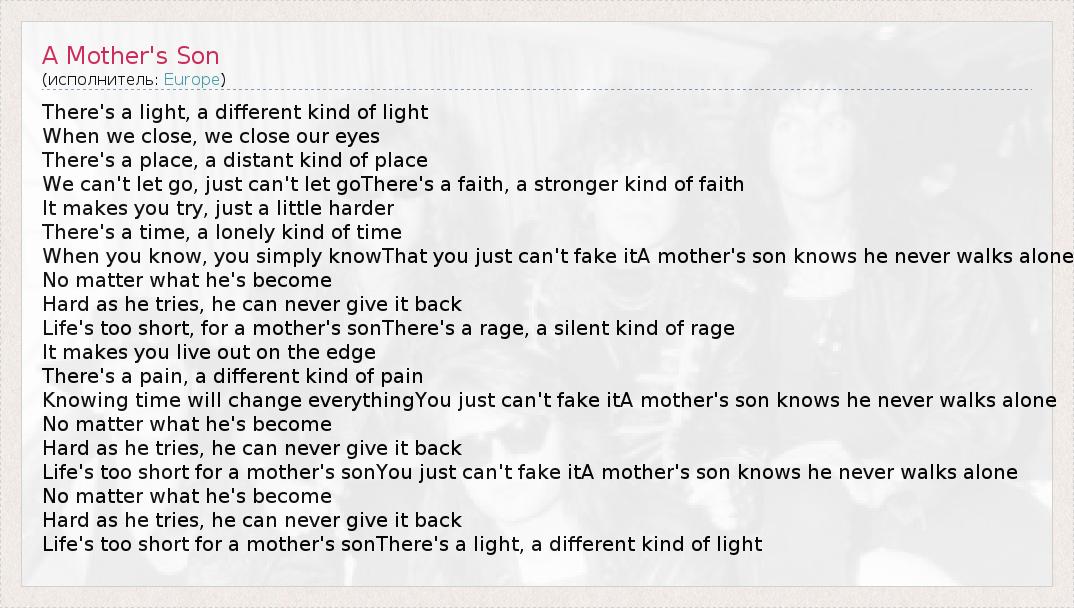 There's a light, a different kind of light When we close, we close our eyes There's a place, a distant kind of place We can't let go, just can't let goThere's a faith, a stronger kind of faith It makes you try, just a little harder There's a time, a lonely kind of time When you know, you simply knowThat you just can't fake itA mother's son knows he never walks alone No matter what he's become Hard as he tries, he can never give it back Life's too short, for a mother's sonThere's a rage, a silent kind of rage It makes you live out on the edge There's a pain, a different kind of pain Knowing time will change everythingYou just can't fake itA mother's son knows he never walks alone No matter what he's become Hard as he tries, he can never give it back Life's too short for a mother's sonYou just can't fake itA mother's son knows he never walks alone No matter what he's become Hard as he tries, he can never give it back Life's too short for a mother's sonThere's a light, a different kind of light