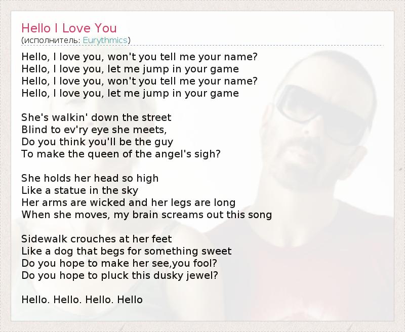 Привет. Я люблю тебя. Скажи мне как тебя зовут? Привет. Я люблю тебя. Не позволишь присоединиться к твоей игре? Она идет по улице, Не замечая никого вокруг. Неужели ты думаешь, что сможешь стать тем парнем, Кто заставит королеву ангелов вздыхать по нему?! Привет. Я люблю тебя. Не скажешь свое имя? Привет. Я люблю тебя. Не позволишь поучаствовать в твоей игре? Она высоко держит голову, Словно статуя в парке. Её руки нежны, а ноги длинны. А когда она движется - в моей голове раздаются звуки этой песни! Все дороги льнут к её ногам, Как собаки выпрашивающие лакомства. Неужто ты надеешься заставить ее увидеть тебя, дурачок?? Неужели ты расчитываешь присвоить это сокровище?! Привет, привет, привет, привет... Я хочу тебя. Ты нужна мне. Любовь.. Привет-привет, привет, привет...