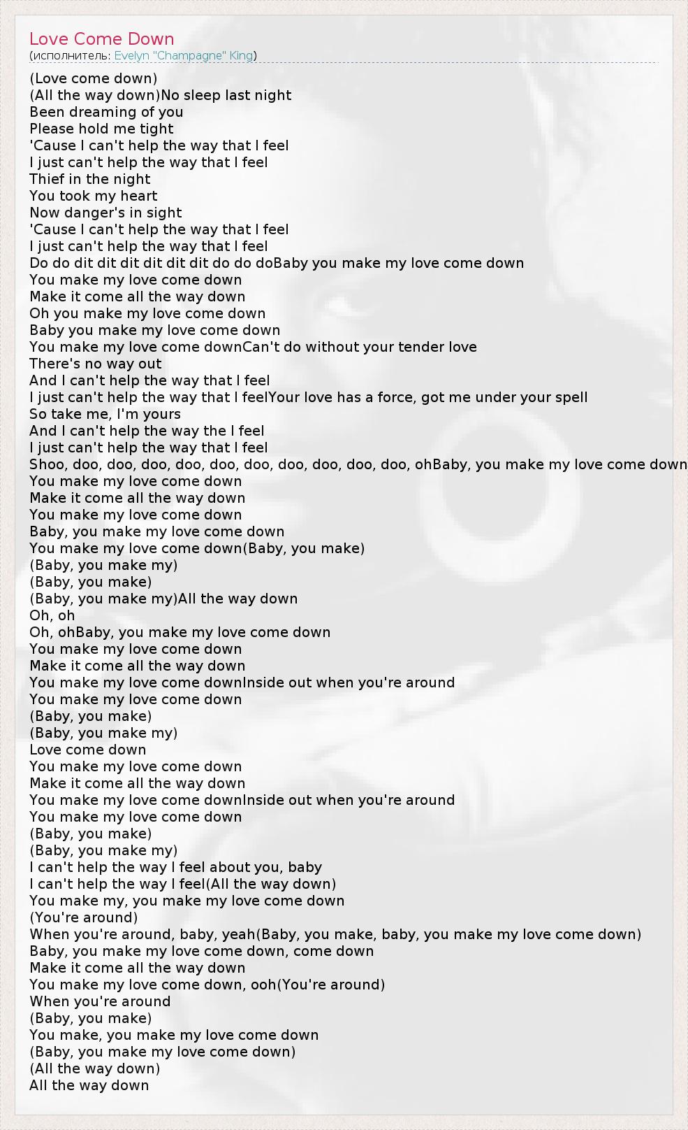 (Love come down) (All the way down)No sleep last night Been dreaming of you Please hold me tight 'Cause I can't help the way that I feel I just can't help the way that I feel Thief in the night You took my heart Now danger's in sight 'Cause I can't help the way that I feel I just can't help the way that I feel Do do dit dit dit dit dit dit do do doBaby you make my love come down You make my love come down Make it come all the way down Oh you make my love come down Baby you make my love come down You make my love come downCan't do without your tender love There's no way out And I can't help the way that I feel I just can't help the way that I feelYour love has a force, got me under your spell So take me, I'm yours And I can't help the way the I feel I just can't help the way that I feel Shoo, doo, doo, doo, doo, doo, doo, doo, doo, doo, doo, ohBaby, you make my love come down You make my love come down Make it come all the way down You make my love come down Baby, you make my love come down You make my love come down(Baby, you make) (Baby, you make my) (Baby, you make) (Baby, you make my)All the way down Oh, oh Oh, ohBaby, you make my love come down You make my love come down Make it come all the way down You make my love come downInside out when you're around You make my love come down (Baby, you make) (Baby, you make my) Love come down You make my love come down Make it come all the way down You make my love come downInside out when you're around You make my love come down (Baby, you make) (Baby, you make my) I can't help the way I feel about you, baby I can't help the way I feel(All the way down) You make my, you make my love come down (You're around) When you're around, baby, yeah(Baby, you make, baby, you make my love come down) Baby, you make my love come down, come down Make it come all the way down You make my love come down, ooh(You're around) When you're around (Baby, you make) You make, you make my love come down (Baby, you make my love come down) (All the way down) All the way down