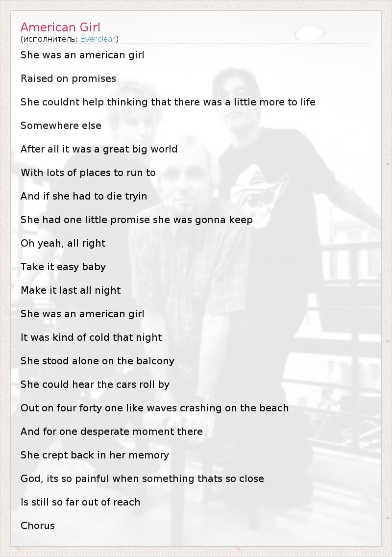 She was an american girl Raised on promises She couldnt help thinking that there was a little more to life Somewhere else After all it was a great big world With lots of places to run to And if she had to die tryin She had one little promise she was gonna keep Oh yeah, all right Take it easy baby Make it last all night She was an american girl It was kind of cold that night She stood alone on the balcony She could hear the cars roll by Out on four forty one like waves crashing on the beach And for one desperate moment there She crept back in her memory God, its so painful when something thats so close Is still so far out of reach Chorus
