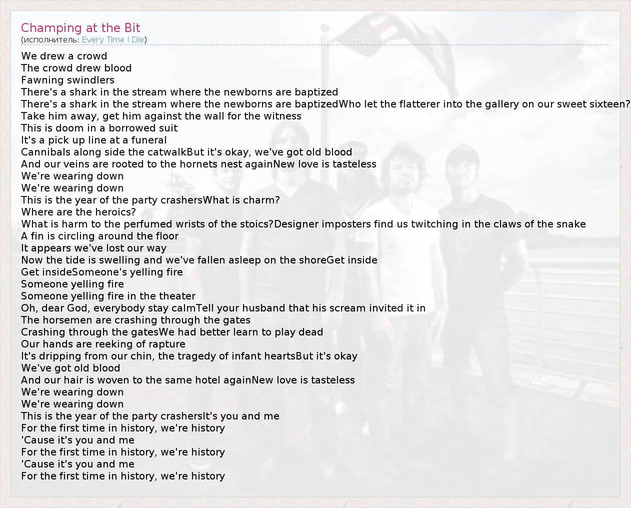 We drew a crowd The crowd drew blood Fawning swindlers There's a shark in the stream where the newborns are baptized There's a shark in the stream where the newborns are baptizedWho let the flatterer into the gallery on our sweet sixteen? Take him away, get him against the wall for the witness This is doom in a borrowed suit It's a pick up line at a funeral Cannibals along side the catwalkBut it's okay, we've got old blood And our veins are rooted to the hornets nest againNew love is tasteless We're wearing down We're wearing down This is the year of the party crashersWhat is charm? Where are the heroics? What is harm to the perfumed wrists of the stoics?Designer imposters find us twitching in the claws of the snake A fin is circling around the floor It appears we've lost our way Now the tide is swelling and we've fallen asleep on the shoreGet inside Get insideSomeone's yelling fire Someone yelling fire Someone yelling fire in the theater Oh, dear God, everybody stay calmTell your husband that his scream invited it in The horsemen are crashing through the gates Crashing through the gatesWe had better learn to play dead Our hands are reeking of rapture It's dripping from our chin, the tragedy of infant heartsBut it's okay We've got old blood And our hair is woven to the same hotel againNew love is tasteless We're wearing down We're wearing down This is the year of the party crashersIt's you and me For the first time in history, we're history 'Cause it's you and me For the first time in history, we're history 'Cause it's you and me For the first time in history, we're history