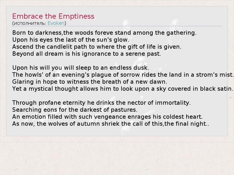 А как ты думаешь, о чем песня "Embrace the Emptiness" ?