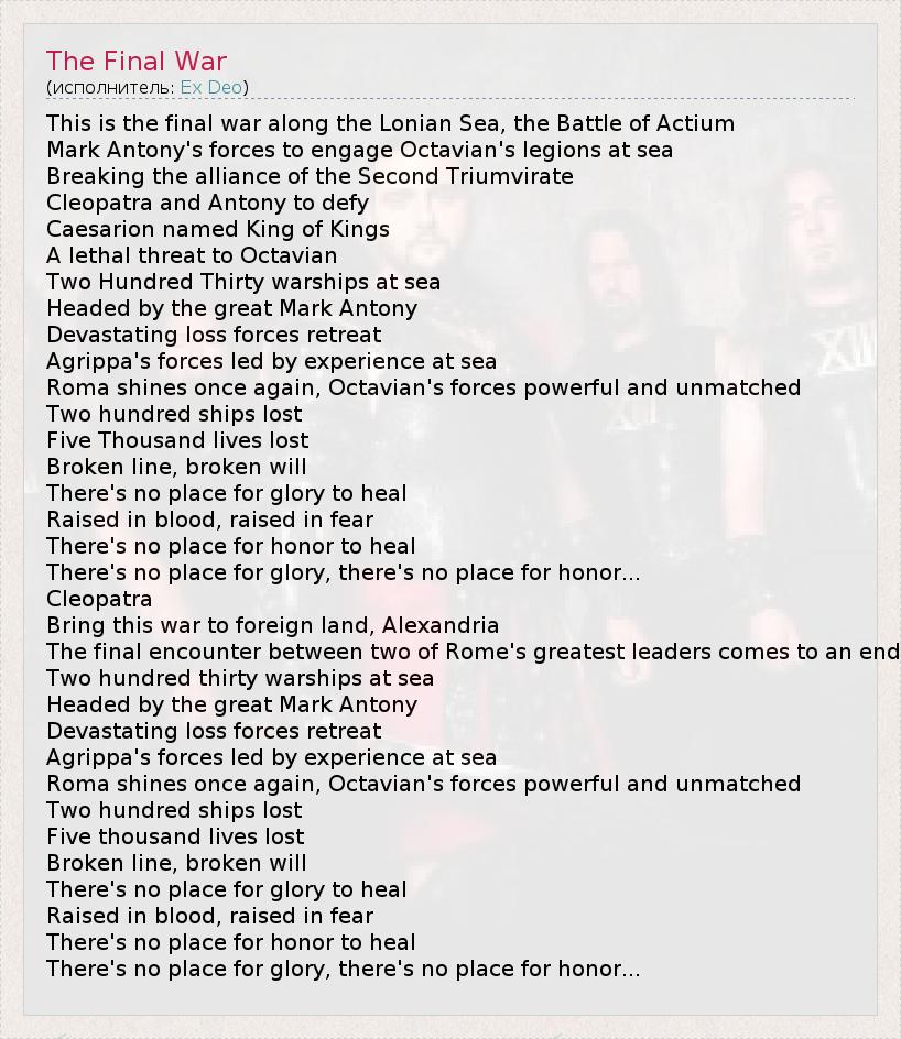 Это интересно:Проект Ex Deo был создан музыкантами Kataklysm совместно с клавишником Джонатаном Ледюком. Они поставили перед собой цель сделать для людей римскую мифологию ближе при помощи дэт-метала. Как и Kataklysm, Ex Deo издается лейблом Nuclear Blast. Первое музыкальное достижение группы - дебютный альбом "Romulus", продюсером которого выступил гитарист группы Жан-Франсуа Дагенэ. Альбом был выпущен 19 июня 2009 года... продолжение