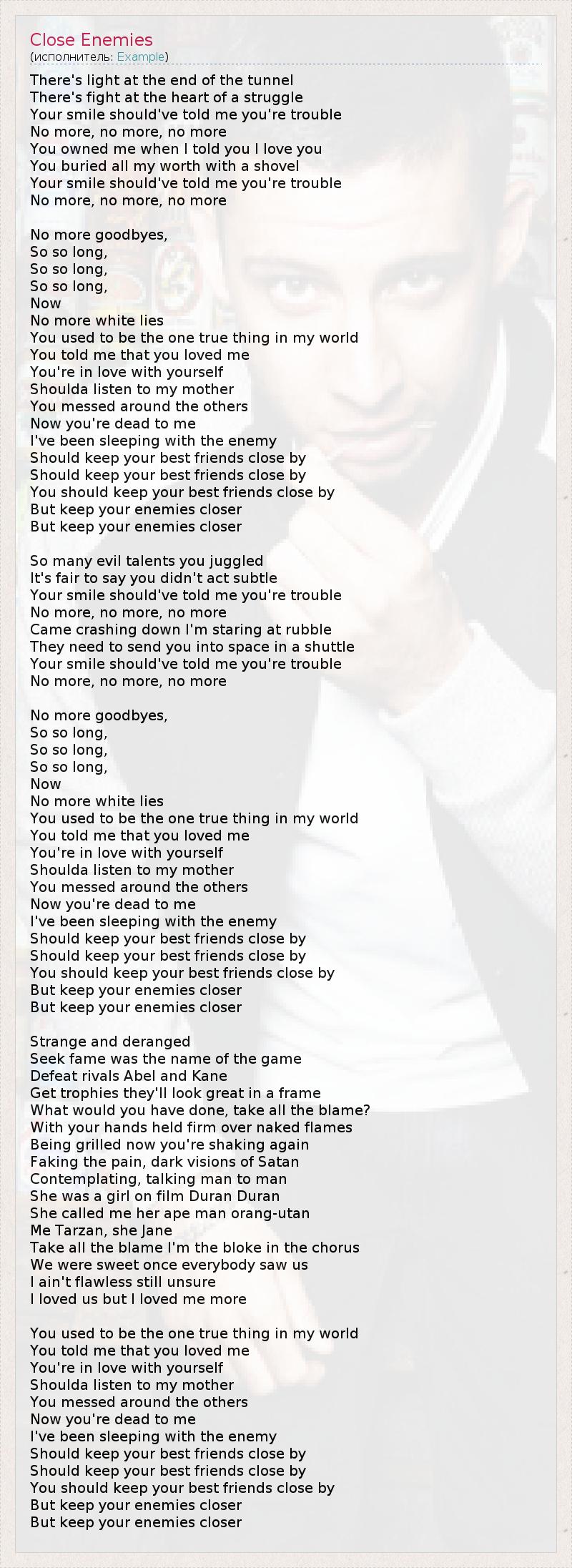 В конце туннеля есть свет. В основе схватки лежит борьба. Твоя улыбка должна была мне рассказать, что ты - источник неприятностей. Уже нет, уже нет, уже нет. Ты завладела мной, когда я сказал, что люблю тебя. Ты похоронила все мое достоинство. Твоя улыбка должна была мне рассказать, что ты - источник неприятностей. Уже нет, уже нет, уже нет. Больше никаких прощаний, Так что пока! Так что пока! Так что пока! Теперь Больше никакой лжи во спасение. Ты была единственной правдой в моем мире. Ты говорила мне, что любишь меня. Ты влюблена в саму себя. Мне следовало послушать свою мать, Ты путалась с другими. Теперь ты для меня умерла. Я спал с врагом. Держи своих лучших друзей близко, Держи своих лучших друзей близко, Тебе следует держать своих лучших друзей близко, А своих врагов еще ближе, А своих врагов еще ближе. Ты скрывала так много дурных склонностей. Справедливо будет сказать, что ты действовала непроницательно. Твоя улыбка должна была мне рассказать, что ты - источник неприятностей. Уже нет, уже нет, уже нет. Ты рухнула для меня, я смотрю на обломки. Им нужно отправить тебя в космос в космическом корабле. Твоя улыбка должна была мне рассказать, что ты - источник неприятностей. Уже нет, уже нет, уже нет. Больше никаких прощаний, Так что пока! Так что пока! Так что пока! Теперь Больше никакой лжи во спасение. Ты была единственной правдой в моем мире. Ты говорила мне, что любишь меня. Ты влюблена в саму себя. Мне следовало послушать свою мать, Ты путалась с другими. Теперь ты для меня умерла. Я спал с врагом. Держи своих лучших друзей близко, Держи своих лучших друзей близко, Тебе следует держать своих лучших друзей близко, А своих врагов еще ближе, А своих врагов еще ближе. Чужая и ненормальная, Стремление к славе - так называлась эта игра. Одолей соперников Каина и Авеля. Получи награды, они будут отлично смотреться в рамочке. Что бы ты сделал, взял бы всю вину на себя? Крепко сжимая руки над открытым пламенем, Жарясь на огне, ты снова дрожишь, Прикидываясь, что тебе больно, притворяясь, что видишь темные образы сатаны, Рассчитывая на откровенный разговор. Она была девушкой на пленке из песни группы Duran Duran. 1 Она называла меня своим обезьяночеловеком, орангутаном. Я был Тарзаном, она - Джейн. 2 Беру всю вину на себя, я - тот парень из припева. Когда-то мы были влюблены, все видели нас. Я не безупречен, и все еще не уверен. Я любил нас, но себя я любил больше. Ты была единственной правдой в моем мире. Ты говорила мне, что любишь меня. Ты влюблена в саму себя. Мне следовало послушать свою мать, Ты путалась с другими. Теперь ты для меня умерла. Я спал с врагом. Держи своих лучших друзей близко, Держи своих лучших друзей близко, Тебе следует держать своих лучших друзей близко, А своих врагов еще ближе, А своих врагов еще ближе. 1 - песня называется "Girls on Film" 2 - возлюбленная Тарзана