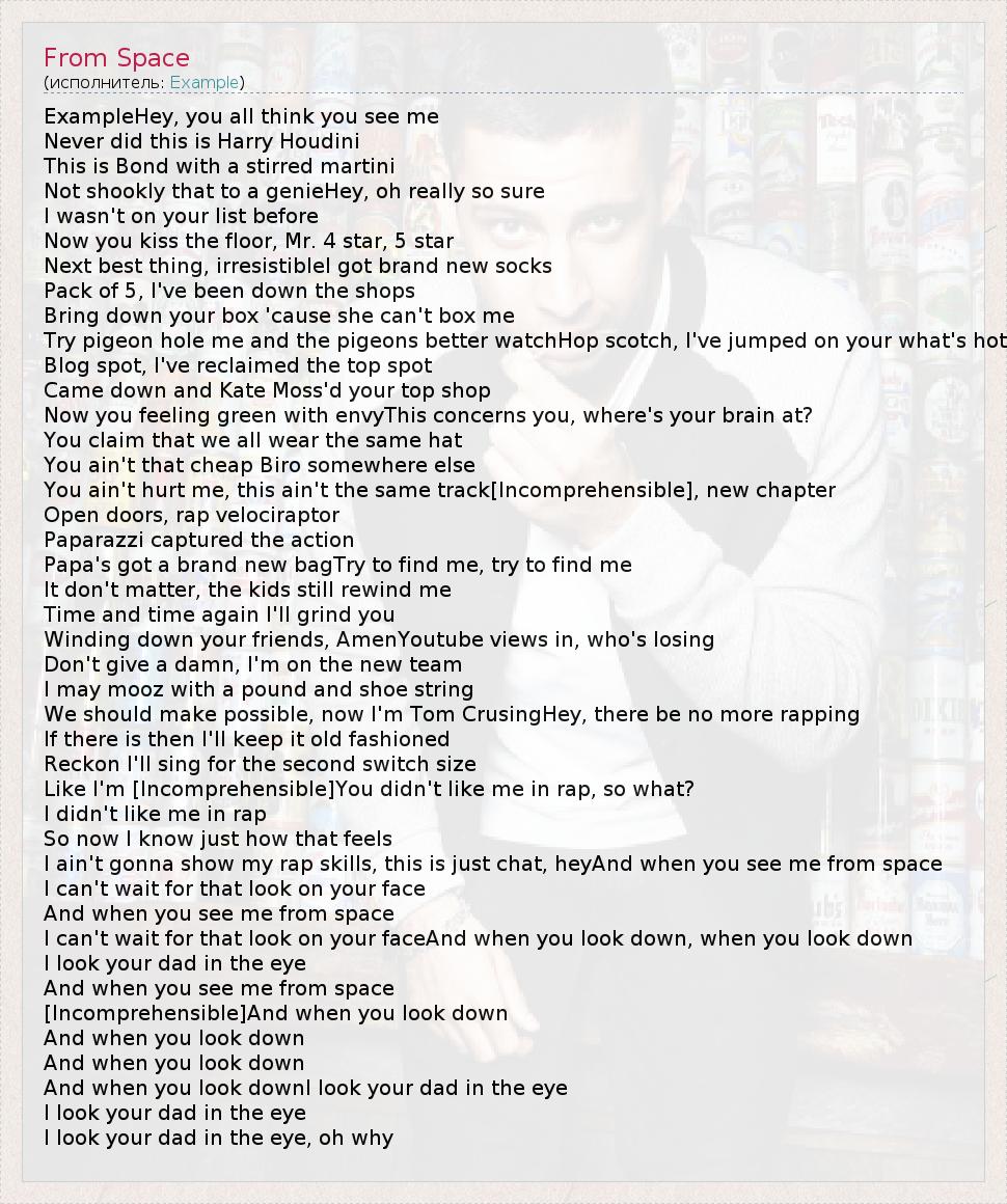 Это интересно:Example (англ. Elliot John Gleave род. 20 июня 1982 года, Лондон, Великобритания) — британский певец и рэпер. Его псевдоним возник от инициалов E.G., что является английским разговорным сокращением латинской фразы «exempli gratia» («например», что и переводится на английский, как «for example»).В начале своей музыкальной карьеры Эллиот выпустил три сингла под собственным лейблом All The Chats, а в 2006 году был замечен... продолжение