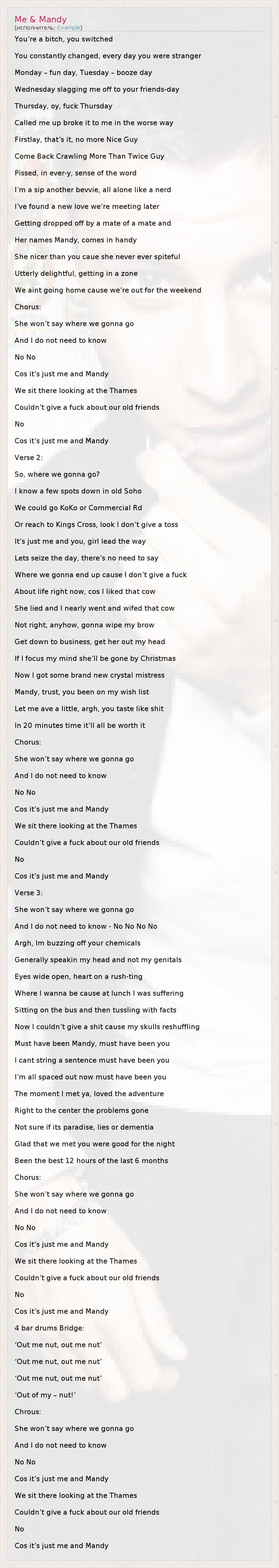 Это интересно:Example (англ. Elliot John Gleave род. 20 июня 1982 года, Лондон, Великобритания) — британский певец и рэпер. Его псевдоним возник от инициалов E.G., что является английским разговорным сокращением латинской фразы «exempli gratia» («например», что и переводится на английский, как «for example»).В начале своей музыкальной карьеры Эллиот выпустил три сингла под собственным лейблом All The Chats, а в 2006 году был замечен... продолжение