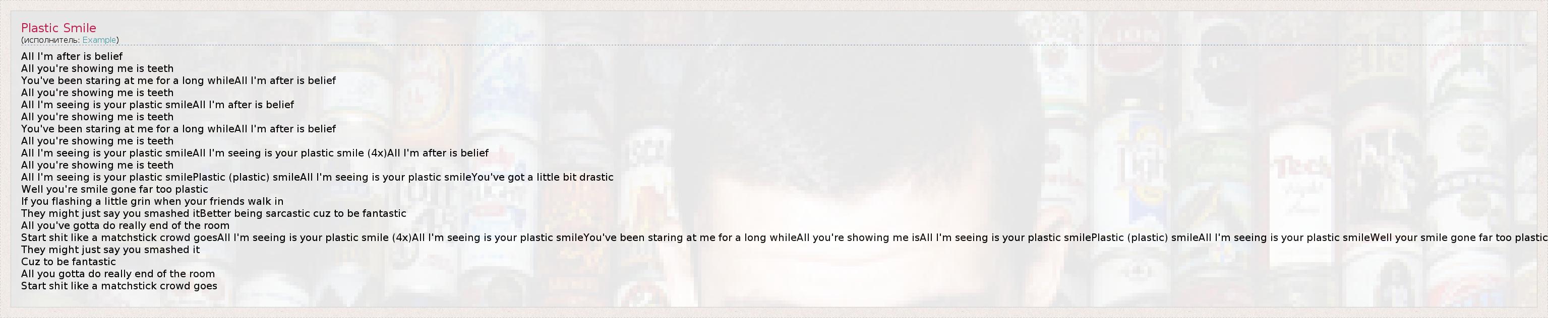 All I'm after is belief All you're showing me is teeth You've been staring at me for a long whileAll I'm after is belief All you're showing me is teeth All I'm seeing is your plastic smileAll I'm after is belief All you're showing me is teeth You've been staring at me for a long whileAll I'm after is belief All you're showing me is teeth All I'm seeing is your plastic smileAll I'm seeing is your plastic smile (4x)All I'm after is belief All you're showing me is teeth All I'm seeing is your plastic smilePlastic (plastic) smileAll I'm seeing is your plastic smileYou've got a little bit drastic Well you're smile gone far too plastic If you flashing a little grin when your friends walk in They might just say you smashed itBetter being sarcastic cuz to be fantastic All you've gotta do really end of the room Start shit like a matchstick crowd goesAll I'm seeing is your plastic smile (4x)All I'm seeing is your plastic smileYou've been staring at me for a long whileAll you're showing me isAll I'm seeing is your plastic smilePlastic (plastic) smileAll I'm seeing is your plastic smileWell your smile gone far too plastic They might just say you smashed it Cuz to be fantastic All you gotta do really end of the room Start shit like a matchstick crowd goes