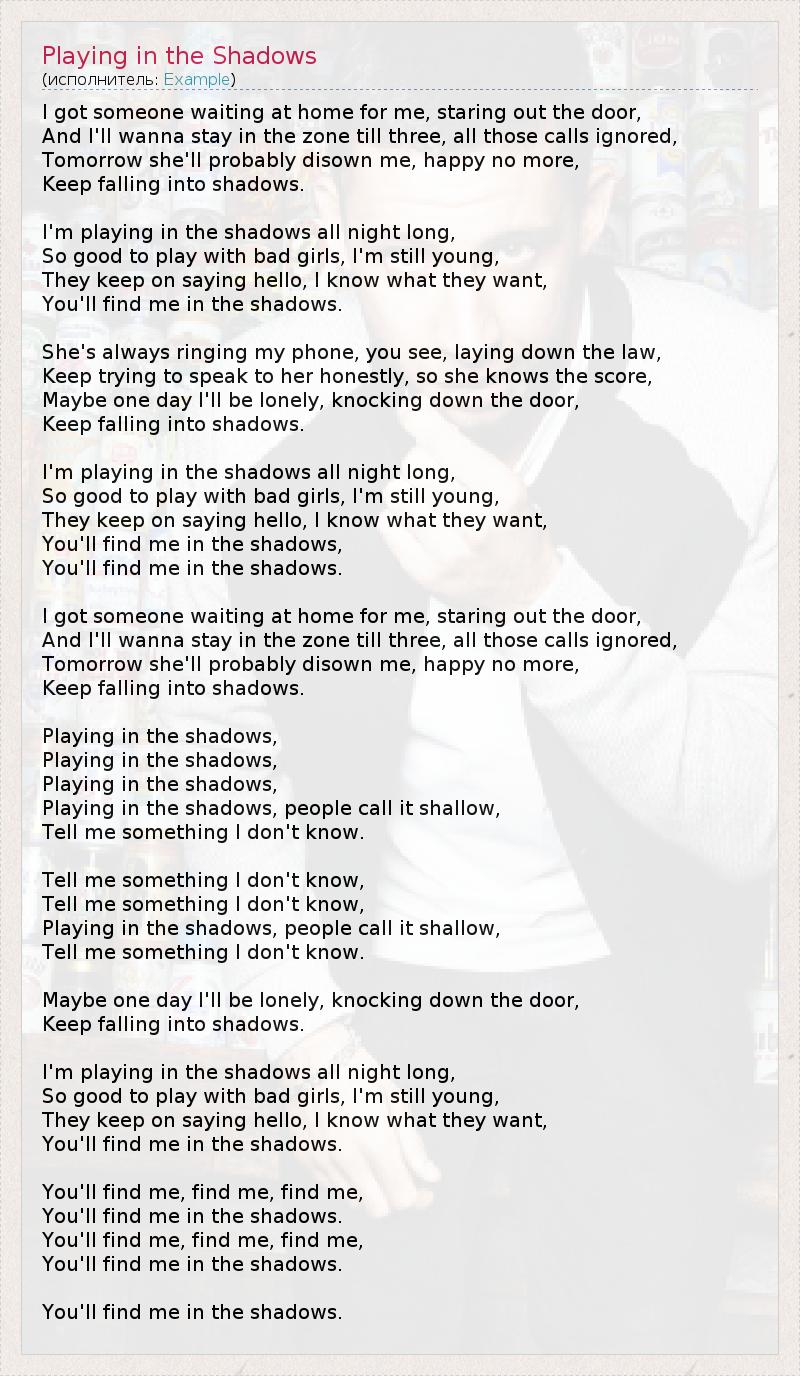 I got someone waiting at home for me, staring out the door, And I'll wanna stay in the zone till three, all those calls ignored, Tomorrow she'll probably disown me, happy no more, Keep falling into shadows. I'm playing in the shadows all night long, So good to play with bad girls, I'm still young, They keep on saying hello, I know what they want, You'll find me in the shadows. She's always ringing my phone, you see, laying down the law, Keep trying to speak to her honestly, so she knows the score, Maybe one day I'll be lonely, knocking down the door, Keep falling into shadows. I'm playing in the shadows all night long, So good to play with bad girls, I'm still young, They keep on saying hello, I know what they want, You'll find me in the shadows, You'll find me in the shadows. I got someone waiting at home for me, staring out the door, And I'll wanna stay in the zone till three, all those calls ignored, Tomorrow she'll probably disown me, happy no more, Keep falling into shadows. Playing in the shadows, Playing in the shadows, Playing in the shadows, Playing in the shadows, people call it shallow, Tell me something I don't know. Tell me something I don't know, Tell me something I don't know, Playing in the shadows, people call it shallow, Tell me something I don't know. Maybe one day I'll be lonely, knocking down the door, Keep falling into shadows. I'm playing in the shadows all night long, So good to play with bad girls, I'm still young, They keep on saying hello, I know what they want, You'll find me in the shadows. You'll find me, find me, find me, You'll find me in the shadows. You'll find me, find me, find me, You'll find me in the shadows. You'll find me in the shadows.