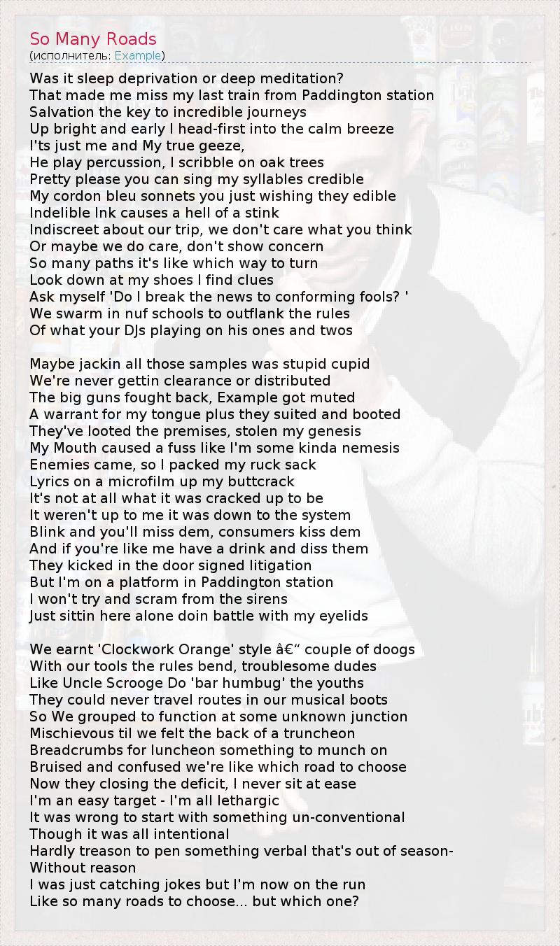 Was it sleep deprivation or deep meditation? That made me miss my last train from Paddington station Salvation the key to incredible journeys Up bright and early I head-first into the calm breeze I'ts just me and My true geeze, He play percussion, I scribble on oak trees Pretty please you can sing my syllables credible My cordon bleu sonnets you just wishing they edible Indelible Ink causes a hell of a stink Indiscreet about our trip, we don't care what you think Or maybe we do care, don't show concern So many paths it's like which way to turn Look down at my shoes I find clues Ask myself 'Do I break the news to conforming fools? ' We swarm in nuf schools to outflank the rules Of what your DJs playing on his ones and twos Maybe jackin all those samples was stupid cupid We're never gettin clearance or distributed The big guns fought back, Example got muted A warrant for my tongue plus they suited and booted They've looted the premises, stolen my genesis My Mouth caused a fuss like I'm some kinda nemesis Enemies came, so I packed my ruck sack Lyrics on a microfilm up my buttcrack It's not at all what it was cracked up to be It weren't up to me it was down to the system Blink and you'll miss dem, consumers kiss dem And if you're like me have a drink and diss them They kicked in the door signed litigation But I'm on a platform in Paddington station I won't try and scram from the sirens Just sittin here alone doin battle with my eyelids We earnt 'Clockwork Orange' style – couple of doogs With our tools the rules bend, troublesome dudes Like Uncle Scrooge Do 'bar humbug' the youths They could never travel routes in our musical boots So We grouped to function at some unknown junction Mischievous til we felt the back of a truncheon Breadcrumbs for luncheon something to munch on Bruised and confused we're like which road to choose Now they closing the deficit, I never sit at ease I'm an easy target - I'm all lethargic It was wrong to start with something un-conventional Though it was all intentional Hardly treason to pen something verbal that's out of season- Without reason I was just catching jokes but I'm now on the run Like so many roads to choose... but which one?