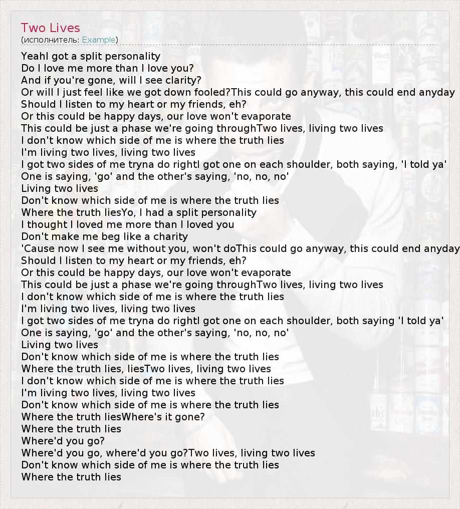 Это интересно:Example (англ. Elliot John Gleave род. 20 июня 1982 года, Лондон, Великобритания) — британский певец и рэпер. Его псевдоним возник от инициалов E.G., что является английским разговорным сокращением латинской фразы «exempli gratia» («например», что и переводится на английский, как «for example»).В начале своей музыкальной карьеры Эллиот выпустил три сингла под собственным лейблом All The Chats, а в 2006 году был замечен... продолжение