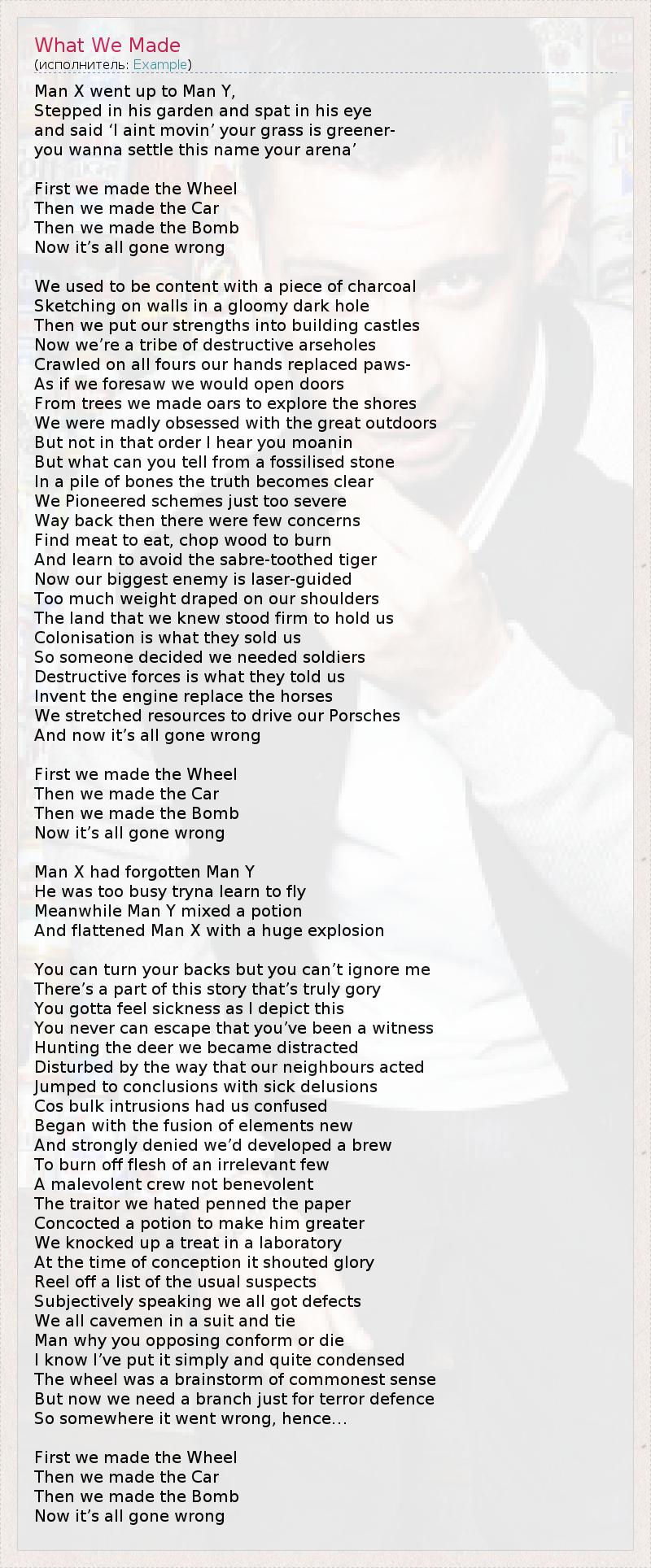 Man X went up to Man Y, Stepped in his garden and spat in his eye and said ‘I aint movin’ your grass is greener- you wanna settle this name your arena’ First we made the Wheel Then we made the Car Then we made the Bomb Now it’s all gone wrong We used to be content with a piece of charcoal Sketching on walls in a gloomy dark hole Then we put our strengths into building castles Now we’re a tribe of destructive arseholes Crawled on all fours our hands replaced paws- As if we foresaw we would open doors From trees we made oars to explore the shores We were madly obsessed with the great outdoors But not in that order I hear you moanin But what can you tell from a fossilised stone In a pile of bones the truth becomes clear We Pioneered schemes just too severe Way back then there were few concerns Find meat to eat, chop wood to burn And learn to avoid the sabre-toothed tiger Now our biggest enemy is laser-guided Too much weight draped on our shoulders The land that we knew stood firm to hold us Colonisation is what they sold us So someone decided we needed soldiers Destructive forces is what they told us Invent the engine replace the horses We stretched resources to drive our Porsches And now it’s all gone wrong First we made the Wheel Then we made the Car Then we made the Bomb Now it’s all gone wrong Man X had forgotten Man Y He was too busy tryna learn to fly Meanwhile Man Y mixed a potion And flattened Man X with a huge explosion You can turn your backs but you can’t ignore me There’s a part of this story that’s truly gory You gotta feel sickness as I depict this You never can escape that you’ve been a witness Hunting the deer we became distracted Disturbed by the way that our neighbours acted Jumped to conclusions with sick delusions Cos bulk intrusions had us confused Began with the fusion of elements new And strongly denied we’d developed a brew To burn off flesh of an irrelevant few A malevolent crew not benevolent The traitor we hated penned the paper Concocted a potion to make him greater We knocked up a treat in a laboratory At the time of conception it shouted glory Reel off a list of the usual suspects Subjectively speaking we all got defects We all cavemen in a suit and tie Man why you opposing conform or die I know I’ve put it simply and quite condensed The wheel was a brainstorm of commonest sense But now we need a branch just for terror defence So somewhere it went wrong, hence… First we made the Wheel Then we made the Car Then we made the Bomb Now it’s all gone wrong