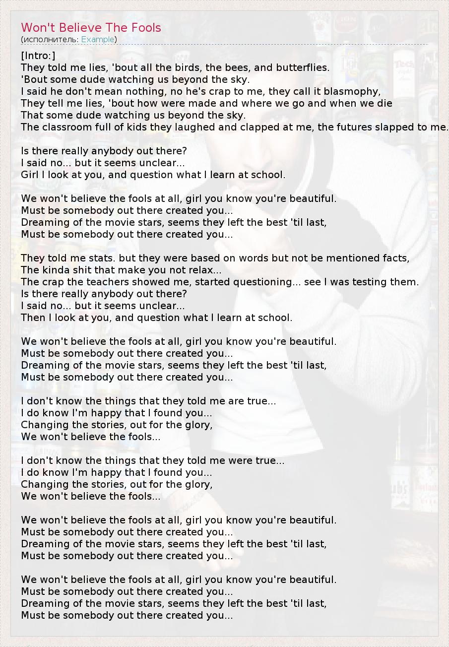 ГлавнаяИсполнителиExampleWon't Believe The Fools