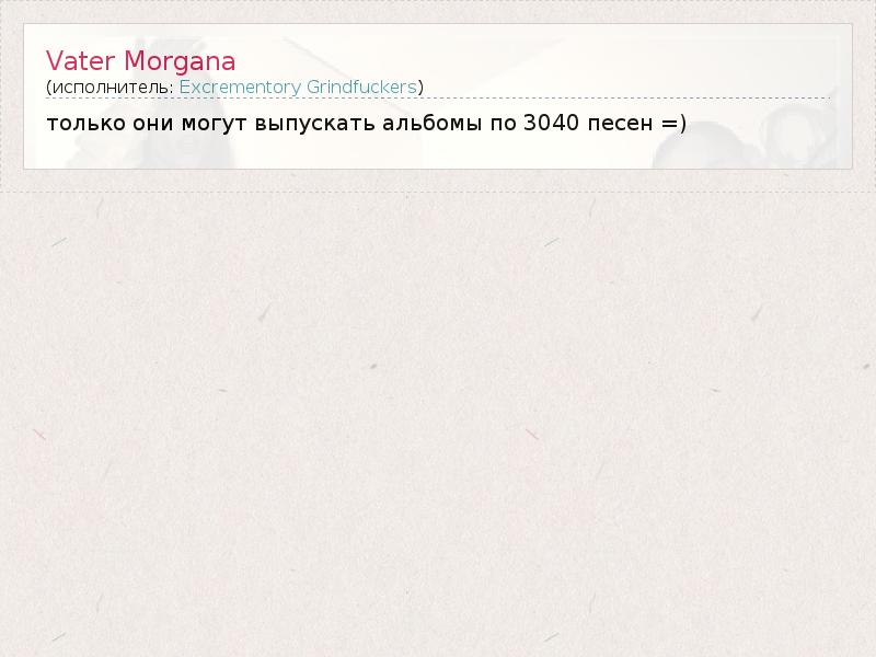 Это интересно:Grindcore - жанр, конечно, узкий, но специфический. Принципиально можно допустить классификацию всех грайндовых групп на серьезных и несерьезных. С серьезных коллективов все началось, это были еще Napalm Death и Repulsion, концепция коих была близка к типичной панковской анархии; потом появились Carcass, начав игру с медицинскими терминами и человеческими органами, что позже такими немцами, как Gut было... продолжение
