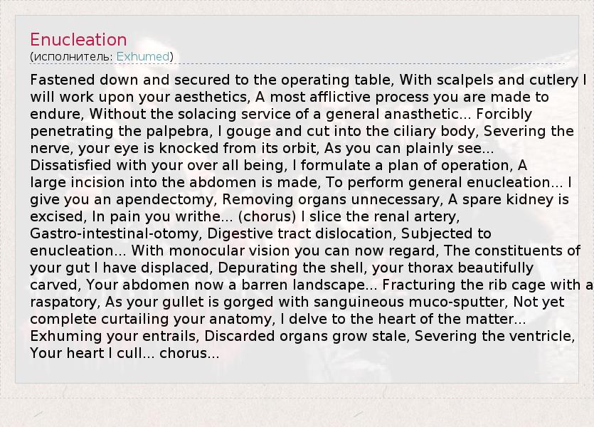 excised, In pain you writhe... (chorus) I slice the renal artery,