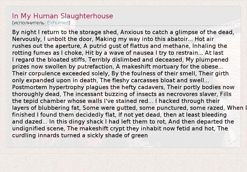 А как ты думаешь, о чем песня "In My Human Slaughterhouse" ?