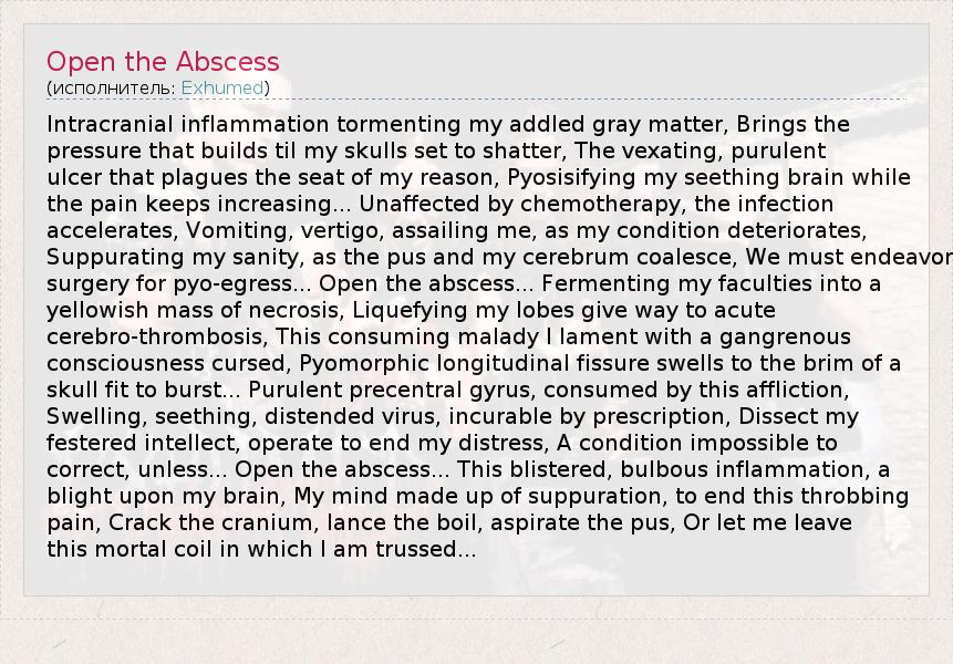 А как ты думаешь, о чем песня "Open the Abscess" ?