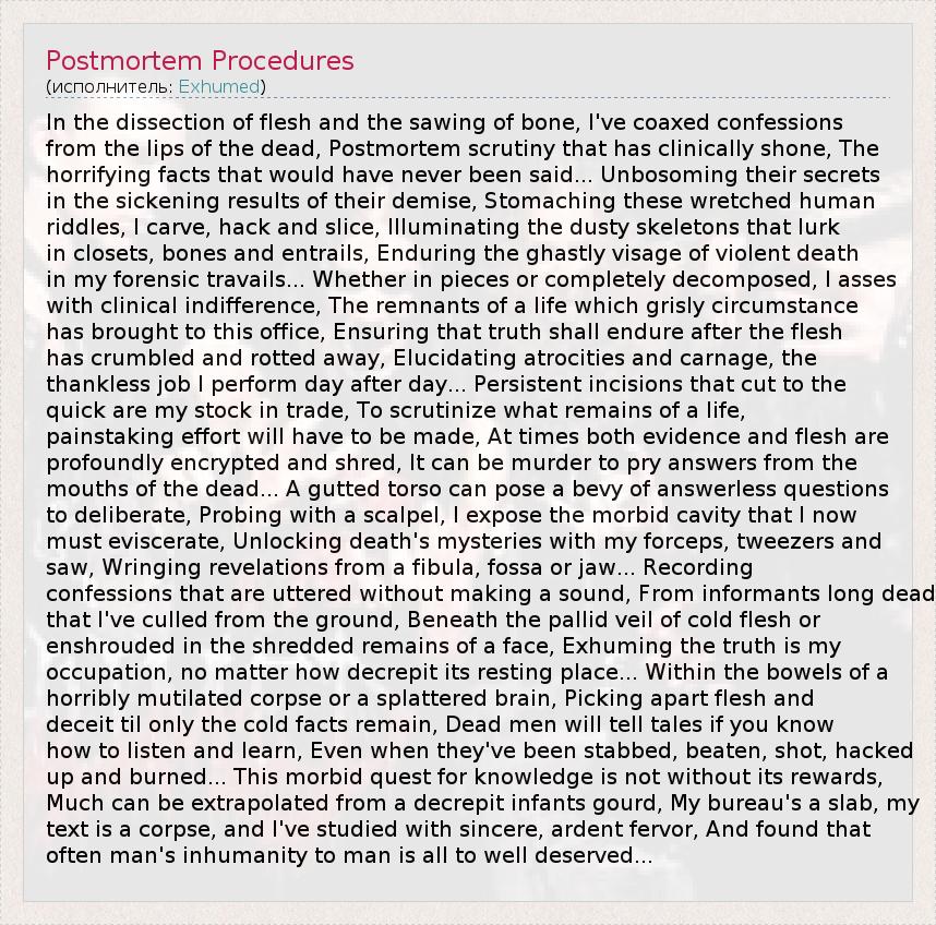А как ты думаешь, о чем песня "Postmortem Procedures" ?