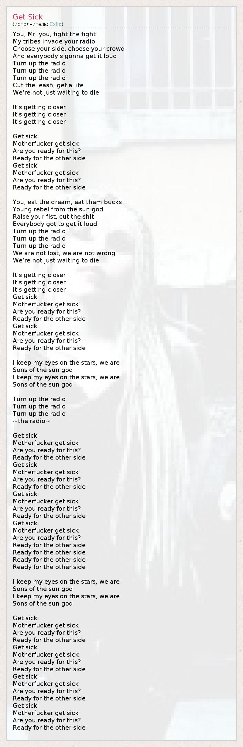 You, Mr. you, fight the fight My tribes invade your radio Choose your side, choose your crowd And everybody's gonna get it loud Turn up the radio Turn up the radio Turn up the radio Cut the leash, get a life We're not just waiting to die It's getting closer It's getting closer It's getting closer Get sick Motherfucker get sick Are you ready for this? Ready for the other side Get sick Motherfucker get sick Are you ready for this? Ready for the other side You, eat the dream, eat them bucks Young rebel from the sun god Raise your fist, cut the shit Everybody got to get it loud Turn up the radio Turn up the radio Turn up the radio We are not lost, we are not wrong We're not just waiting to die It's getting closer It's getting closer It's getting closer Get sick Motherfucker get sick Are you ready for this? Ready for the other side Get sick Motherfucker get sick Are you ready for this? Ready for the other side I keep my eyes on the stars, we are Sons of the sun god I keep my eyes on the stars, we are Sons of the sun god Turn up the radio Turn up the radio Turn up the radio ~the radio~ Get sick Motherfucker get sick Are you ready for this? Ready for the other side Get sick Motherfucker get sick Are you ready for this? Ready for the other side Get sick Motherfucker get sick Are you ready for this? Ready for the other side Get sick Motherfucker get sick Are you ready for this? Ready for the other side Ready for the other side Ready for the other side Ready for the other side I keep my eyes on the stars, we are Sons of the sun god I keep my eyes on the stars, we are Sons of the sun god Get sick Motherfucker get sick Are you ready for this? Ready for the other side Get sick Motherfucker get sick Are you ready for this? Ready for the other side Get sick Motherfucker get sick Are you ready for this? Ready for the other side Get sick Motherfucker get sick Are you ready for this? Ready for the other side