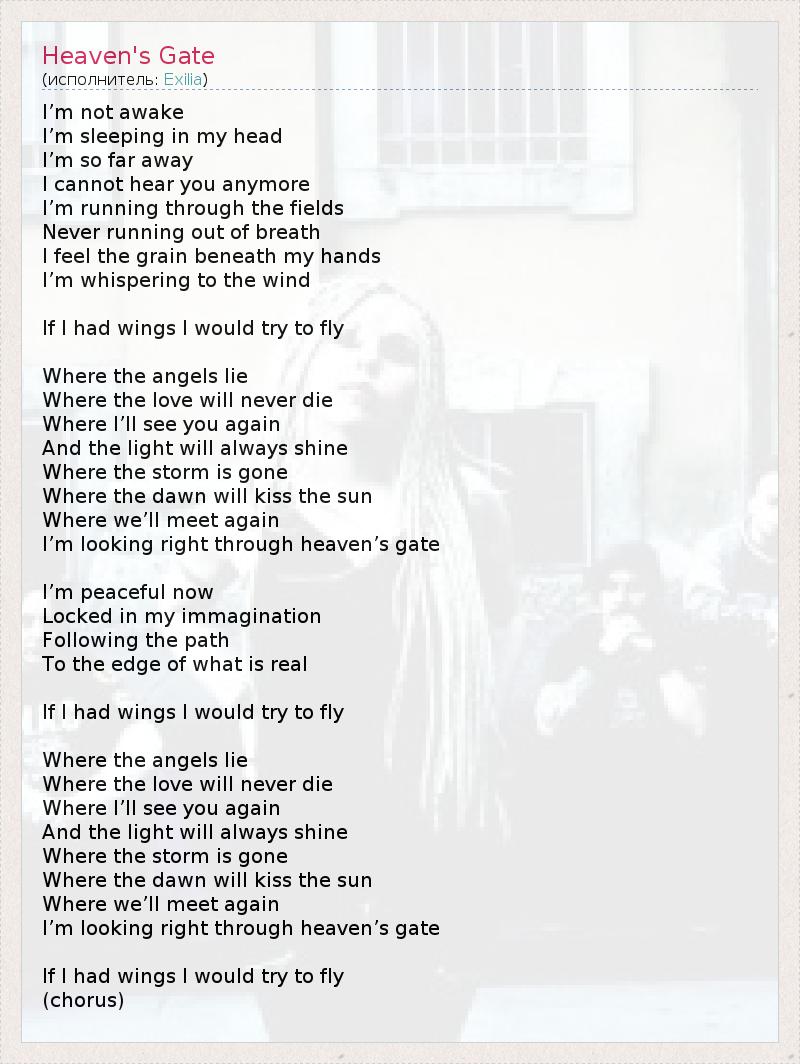 I’m not awake I’m sleeping in my head I’m so far away I cannot hear you anymore I’m running through the fields Never running out of breath I feel the grain beneath my hands I’m whispering to the wind If I had wings I would try to fly Where the angels lie Where the love will never die Where I’ll see you again And the light will always shine Where the storm is gone Where the dawn will kiss the sun Where we’ll meet again I’m looking right through heaven’s gate I’m peaceful now Locked in my immagination Following the path To the edge of what is real If I had wings I would try to fly Where the angels lie Where the love will never die Where I’ll see you again And the light will always shine Where the storm is gone Where the dawn will kiss the sun Where we’ll meet again I’m looking right through heaven’s gate If I had wings I would try to fly (chorus)