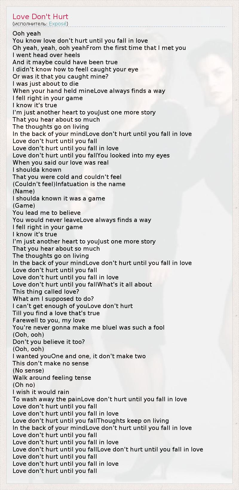 Ooh yeah You know love don't hurt until you fall in love Oh yeah, yeah, ooh yeahFrom the first time that I met you I went head over heels And it maybe could have been true I didn't know how to feelI caught your eye Or was it that you caught mine? I was just about to die When your hand held mineLove always finds a way I fell right in your game I know it's true I'm just another heart to youJust one more story That you hear about so much The thoughts go on living In the back of your mindLove don't hurt until you fall in love Love don't hurt until you fall Love don't hurt until you fall in love Love don't hurt until you fallYou looked into my eyes When you said our love was real I shoulda known That you were cold and couldn't feel (Couldn't feel)Infatuation is the name (Name) I shoulda known it was a game (Game) You lead me to believe You would never leaveLove always finds a way I fell right in your game I know it's true I'm just another heart to youJust one more story That you hear about so much The thoughts go on living In the back of your mindLove don't hurt until you fall in love Love don't hurt until you fall Love don't hurt until you fall in love Love don't hurt until you fallWhat's it all about This thing called love? What am I supposed to do? I can't get enough of youLove don't hurt Till you find a love that's true Farewell to you, my love You're never gonna make me blueI was such a fool (Ooh, ooh) Don't you believe it too? (Ooh, ooh) I wanted youOne and one, it don't make two This don't make no sense (No sense) Walk around feeling tense (Oh no) I wish it would rain To wash away the painLove don't hurt until you fall in love Love don't hurt until you fall Love don't hurt until you fall in love Love don't hurt until you fallThoughts keep on living In the back of your mindLove don't hurt until you fall in love Love don't hurt until you fall Love don't hurt until you fall in love Love don't hurt until you fallLove don't hurt until you fall in love Love don't hurt until you fall Love don't hurt until you fall in love Love don't hurt until you fall
