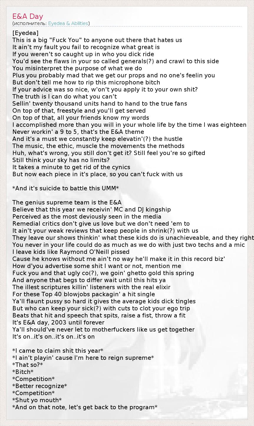 [Eyedea] This is a big "Fuck You" to anyone out there that hates us It ain't my fault you fail to recognize what great is If you weren't so caught up in who you dick ride You'd see the flaws in your so called generals(?) and crawl to this side You misinterpret the purpose of what we do Plus you probably mad that we get our props and no one's feelin you But don't tell me how to rip this microphone bitch If your advice was so nice, w'on't you apply it to your own shit? The truth is I can do what you can't Sellin' twenty thousand units hand to hand to the true fans On top of that, freestyle and you'll get served On top of that, all your friends know my words I accomplished more than you will in your whole life by the time I was eighteen Never workin' a 9 to 5, that's the E&A theme And it's a must we constantly keep elevatin'(?) the hustle The music, the ethic, muscle the movements the methods Huh, what's wrong, you still don't get it? Still feel you're so gifted Still think your sky has no limits? It takes a minute to get rid of the cynics But now each piece in it's place, so you can't fuck with us *And it's suicide to battle this UMM* The genius supreme team is the E&A Believe that this year we receivin' MC and DJ kingship Perceived as the most deviously seen in the media Remedial critics don't give us love but we don't need 'em to It ain't your weak reviews that keep people in shrink(?) with us They leave our shows thinkin' what these kids do is unachieveable, and they right You never in your life could do as much as we do with just two techs and a mic I leave kids like Raymond O'Neill pissed Cause he knows without me ain't no way he'll make it in this record biz' How d'you advertise some shit I want or not, mention me Fuck you and that ugly co(?), we goin' ghetto gold this spring And anyone that begs to differ wait until this hits ya The illest scriptures killin' listeners with the real elixir For these Top 40 blowjobs packagin' a hit single Ya'll flaunt pussy so hard it gives the average kids dick tingles But who can keep your sick(?) with cuts to clot your ego trip Beats that hit and speech that spits, raise a fist, throw a fit It's E&A day, 2003 until forever Ya'll should've never let to motherfuckers like us get together It's on..it's on..it's on..it's on *I came to claim shit this year* *I ain't playin' cause I'm here to reign supreme* *That so?* *Bitch* *Competition* *Better recognize* *Competition* *Shut yo mouth* *And on that note, let's get back to the program*