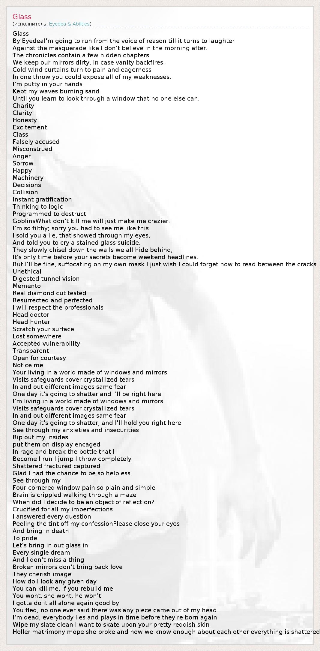 Это интересно:«Eyedea & Abilities» - одни из наиболее влиятельных представителей современного независимого рэпа. DJ Abilities (Gregory Keltgen) и МС Eyedea (Micheal Larsen) начали сотрудничать ещё в первой половине 90-х годов. Вначале дуэт назывался «Sixth Sense», позже сменив название на «Eyedea & Abilities». Довольно быстро дуэт стал знаменит в среде поклонников андеграунда благодаря социально-философским текстам Eyedea и экспериментальной... продолжение