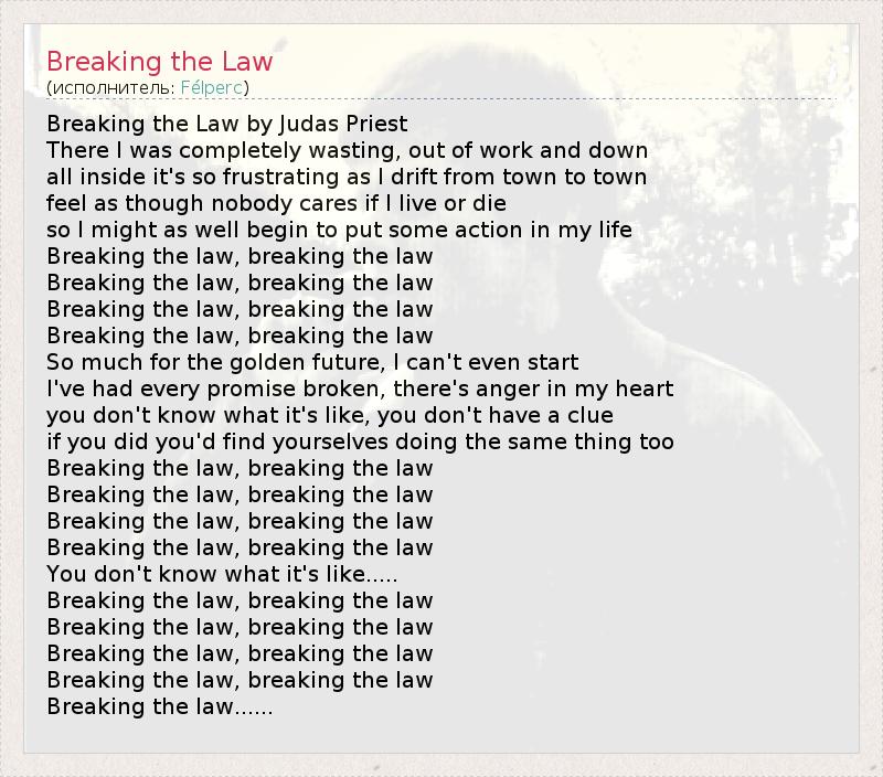 Breaking the Law by Judas Priest There I was completely wasting, out of work and down all inside it's so frustrating as I drift from town to town feel as though nobody cares if I live or die so I might as well begin to put some action in my life Breaking the law, breaking the law Breaking the law, breaking the law Breaking the law, breaking the law Breaking the law, breaking the law So much for the golden future, I can't even start I've had every promise broken, there's anger in my heart you don't know what it's like, you don't have a clue if you did you'd find yourselves doing the same thing too Breaking the law, breaking the law Breaking the law, breaking the law Breaking the law, breaking the law Breaking the law, breaking the law You don't know what it's like..... Breaking the law, breaking the law Breaking the law, breaking the law Breaking the law, breaking the law Breaking the law, breaking the law Breaking the law......