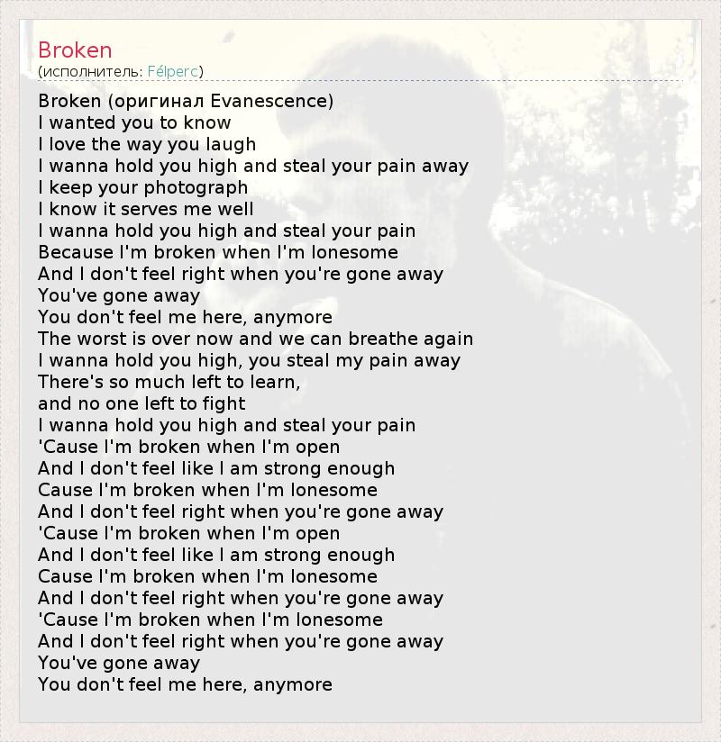 Broken (оригинал Evanescence) I wanted you to know I love the way you laugh I wanna hold you high and steal your pain away I keep your photograph I know it serves me well I wanna hold you high and steal your pain Because I'm broken when I'm lonesome And I don't feel right when you're gone away You've gone away You don't feel me here, anymore The worst is over now and we can breathe again I wanna hold you high, you steal my pain away There's so much left to learn, and no one left to fight I wanna hold you high and steal your pain 'Cause I'm broken when I'm open And I don't feel like I am strong enough Cause I'm broken when I'm lonesome And I don't feel right when you're gone away 'Cause I'm broken when I'm open And I don't feel like I am strong enough Cause I'm broken when I'm lonesome And I don't feel right when you're gone away 'Cause I'm broken when I'm lonesome And I don't feel right when you're gone away You've gone away You don't feel me here, anymore