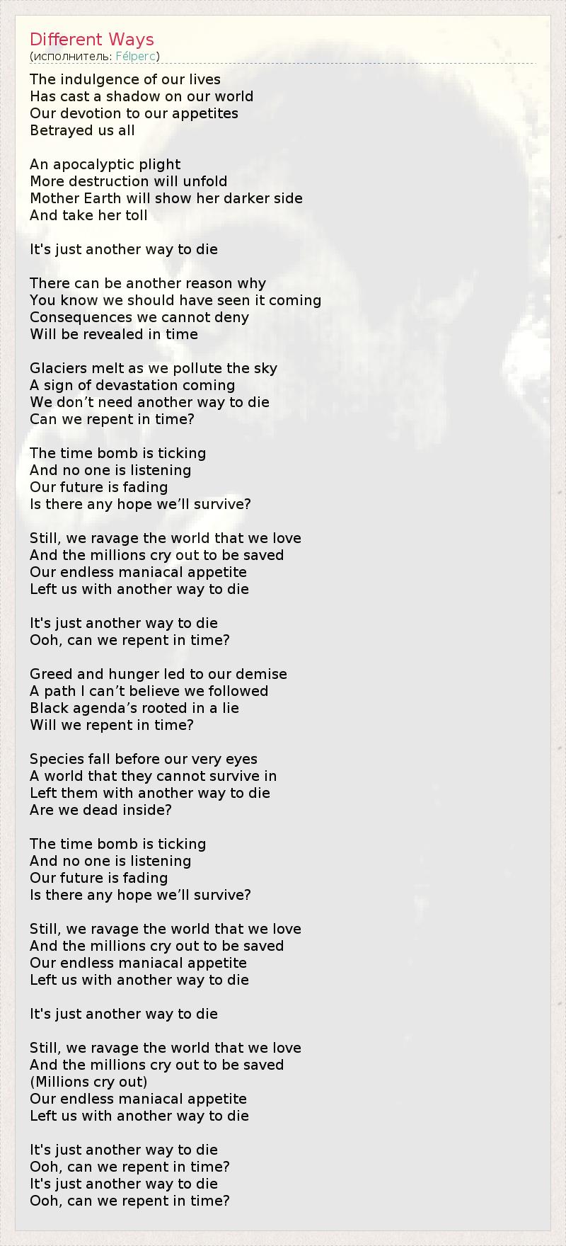 Потакание нашим слабостям Наслало тень на наш мир. Наша преданность аппетитам Предала нас всех. На грани Апокалипсиса, Разрушений будет больше. Земля-Матушка покажет свою тёмную сторону И возьмёт свою плату. Это всего лишь ещё один способ умереть. И быть не может никакой другой причины, Ты знаешь, мы должны были это предвидеть. Последствия, которые мы не можем отрицать, Проявятся в скором времени. Ледники тают, пока мы загрязняем небо, - Предзнаменование грядущего опустошения. Нам не нужен ещё один способ умереть, Можем ли мы раскаяться, пока не поздно? Часовая бомба тикает, И никто не слушает. Наше будущее исчезает, Есть ли надежда, что мы выживем? Всё же мы разоряем мир, который любим, И миллионы молят о спасении. Наш безграничный маниакальный аппетит Оставил нам лишь ещё один способ умереть. Это всего лишь ещё один способ умереть. Ооо, можем ли мы раскаяться, пока не поздно? Жадность и голод вели нас к гибели, Не верится, что мы пошли этим путём. Чёрные планы укоренились во лжи, Можем ли мы раскаяться, пока не поздно? Виды вымирают, прямо у нас перед глазами Мир, в котором они не могут выжить. Мы оставили им лишь ещё один способ умереть, Мы мертвы внутри? Часовая бомба тикает, И никто не слушает. Наше будущее исчезает, Есть ли надежда, что мы выживем? Всё же мы разоряем мир, который любим, И миллионы молят о спасении. Наш безграничный маниакальный аппетит Оставил нам лишь ещё один способ умереть. Это всего лишь ещё один способ умереть. Всё же мы разоряем мир, который любим, И миллионы молят о спасении. (Миллионы молят) Наш безграничный маниакальный аппетит Оставил нам лишь ещё один способ умереть. Это всего лишь ещё один способ умереть. Ооо, можем ли мы раскаяться, пока не поздно? Это всего лишь ещё один способ умереть. Ооо, можем ли мы раскаяться, пока не поздно?