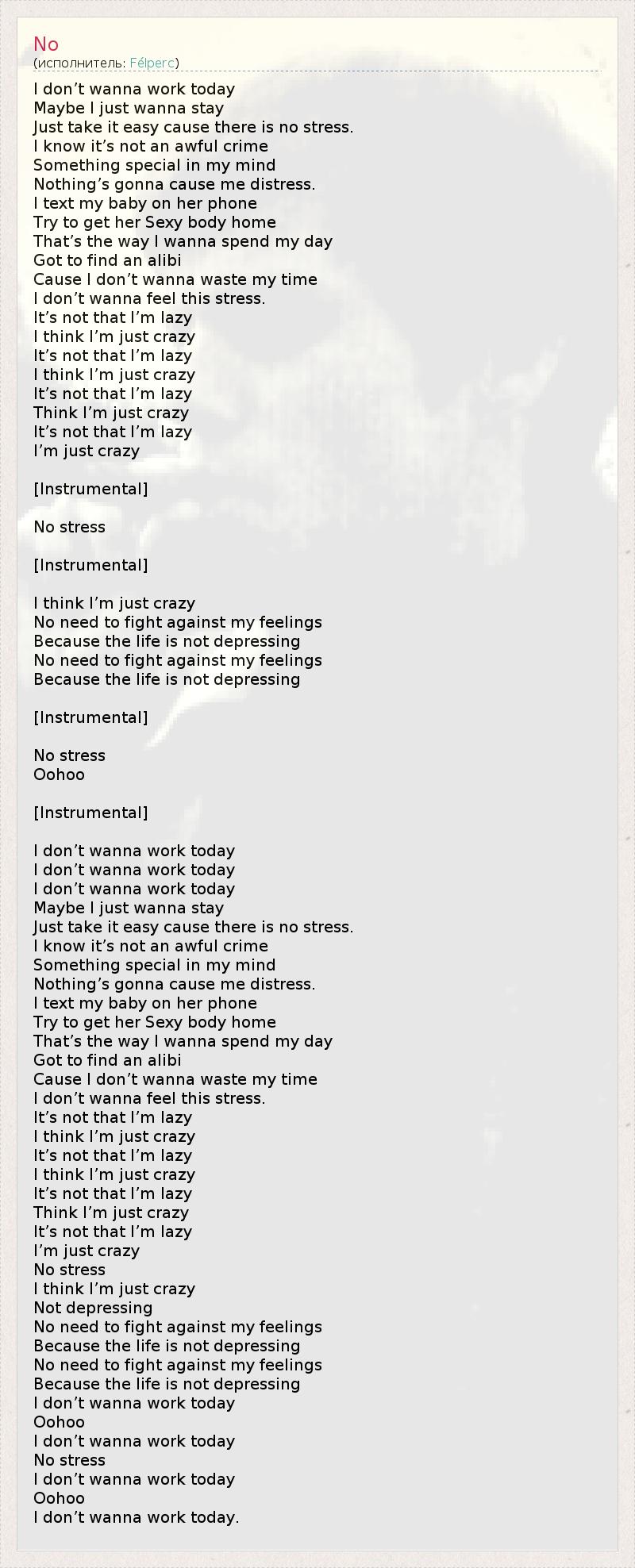 Сегодня я не хочу работать Можно просто остаться Забей, потому что стресса нет Я знаю, что это не ужасное преступление Что-то особенное в моем мозгу Ничто не может вызвать во мне стресс Я пишу своей крошке, постараться притащить своё сексуальное тело домой Вот как я хочу провести сегодняшний день Ну вот и нашел себе алиби Потому что не хочу тратить свое время Я не хочу испытывать стресс Это не значит что я ленивый Я думаю, я не много сумасшедший Это не значит что я ленивый Я думаю, я не много сумасшедший Это не значит что я ленивый Думаю, я не много сумасшедший Это не значит что я ленивый Я не много сумасшедший Нет стресса Я думаю, я не много сумасшедший Нет нужды воевать с моими чувствами Потому что жизнь это не депрессия Нет нужды воевать с моими чувствами Потому что жизнь это не депрессия Нет стресса Я не хочу сегодня работать Я не хочу сегодня работать Сегодня я не хочу работать Можно просто остаться Забей, потому что стресса нет Я знаю, что это не ужасное преступление Что-то особенное в моем мозгу Ничто не может вызвать во мне стресс Я пишу своей крошке, постараться притащить своё сексуальное тело домой Вот как я хочу провести сегодняшний день Ну вот и нашел себе алиби Потому что не хочу тратить свое время Я не хочу испытывать стресс Это не значит что я ленивый Я думаю, я не много сумасшедший Это не значит что я ленивый Я думаю, я не много сумасшедший Это не значит что я ленивый Думаю, я не много сумасшедший Это не значит что я ленивый Я не много сумасшедший Нет стресса Я думаю, я не много сумасшедший Нет нужды воевать с моими чувствами Потому что жизнь это не депрессия Нет нужды воевать с моими чувствами Потому что жизнь это не депрессия Я не хочу сегодня работать (4 раза)
